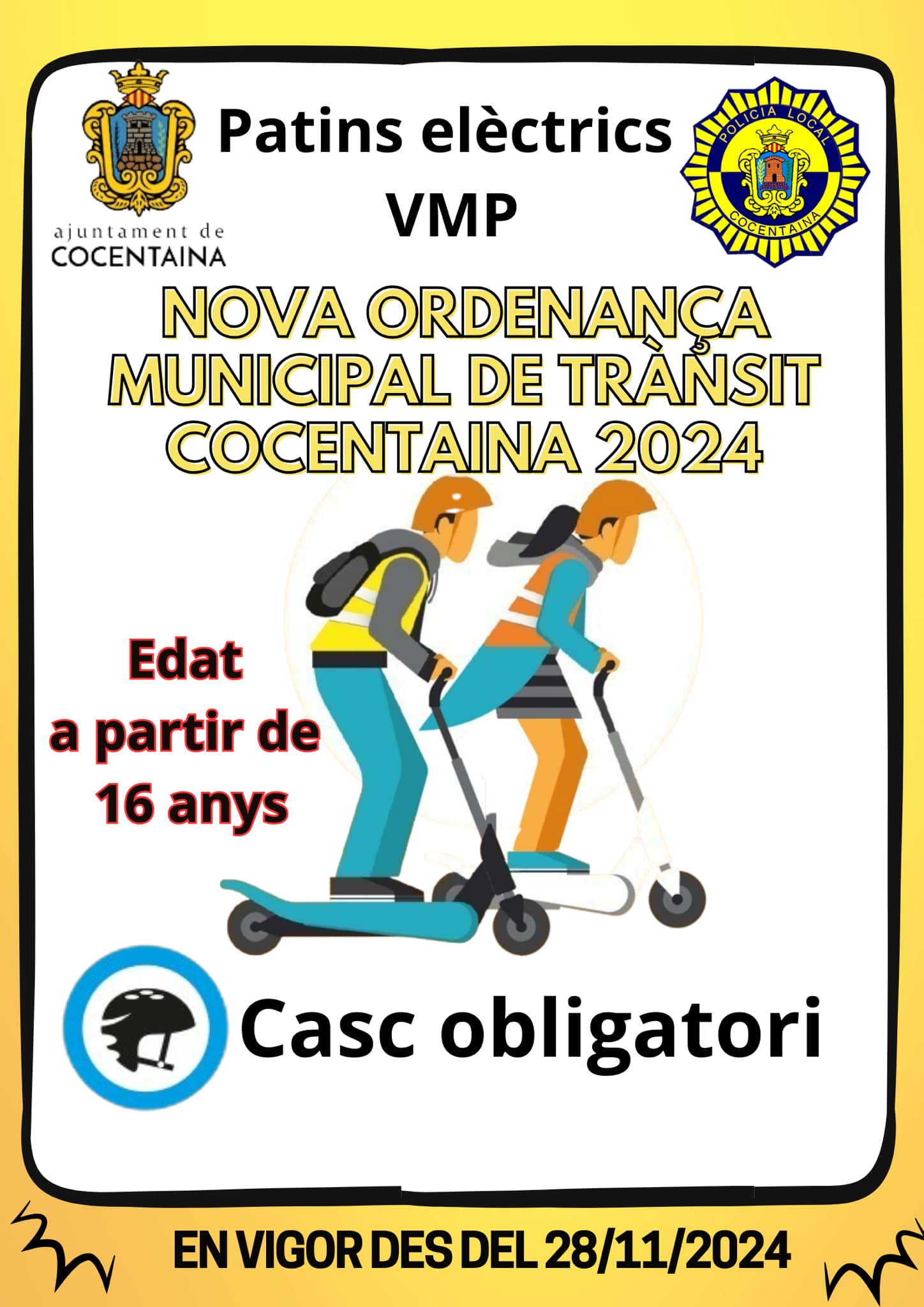 Com la nova ordenança és recent, la Policia Local s'encarregarà d'informar al respecte i establirà punts de control durant les pròximes setmanes en diferents punts del municipi. El cap de la Policia Local, Javier Prats, explica que l'objectiu de la nova ordenança és "millorar la convivència i la seguretat entre els vehicles i els vianants que circulen per Cocentaina. És evident que els patinets elèctrics han proliferat de manera important al nostre poble, especialment entre els més joves, i feia temps que existien problemes de trànsit i convivència causats per esta classe de vehicle. Per este motiu, era molt necessari la modificació de l’ordenança de trànsit per a incloure estos nous aspectes".