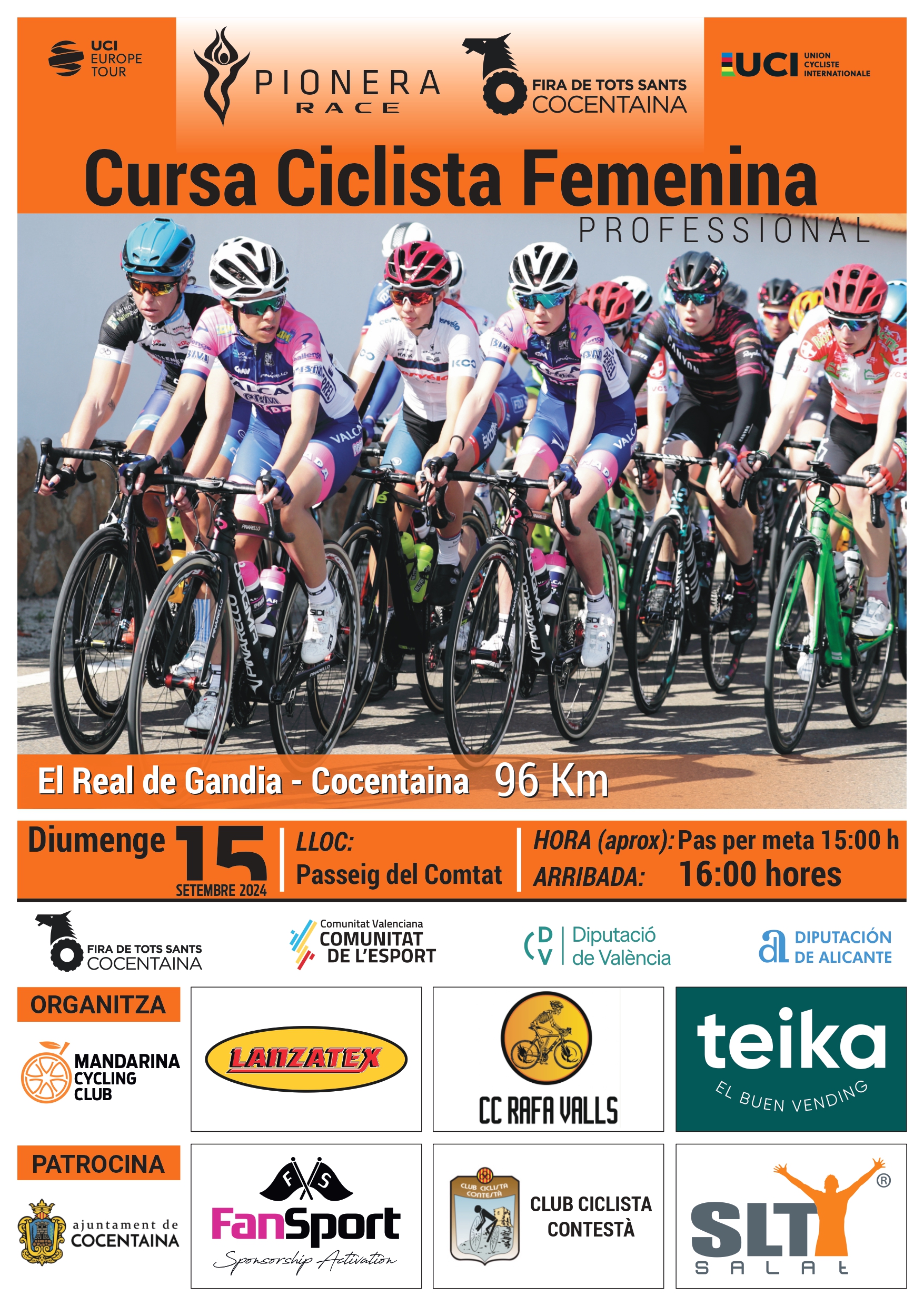 Pionera Race és un esdeveniment de ciclisme femení internacional en el qual participen 18 equips de Gran Bretanya, Portugal, Itàlia i Espanya, entre altres, amb 96 km de ruta. El pas per meta està previst a les 15:00 hores del mateix dia al Passeig del Comtat i l’arribada a les 16:00h.