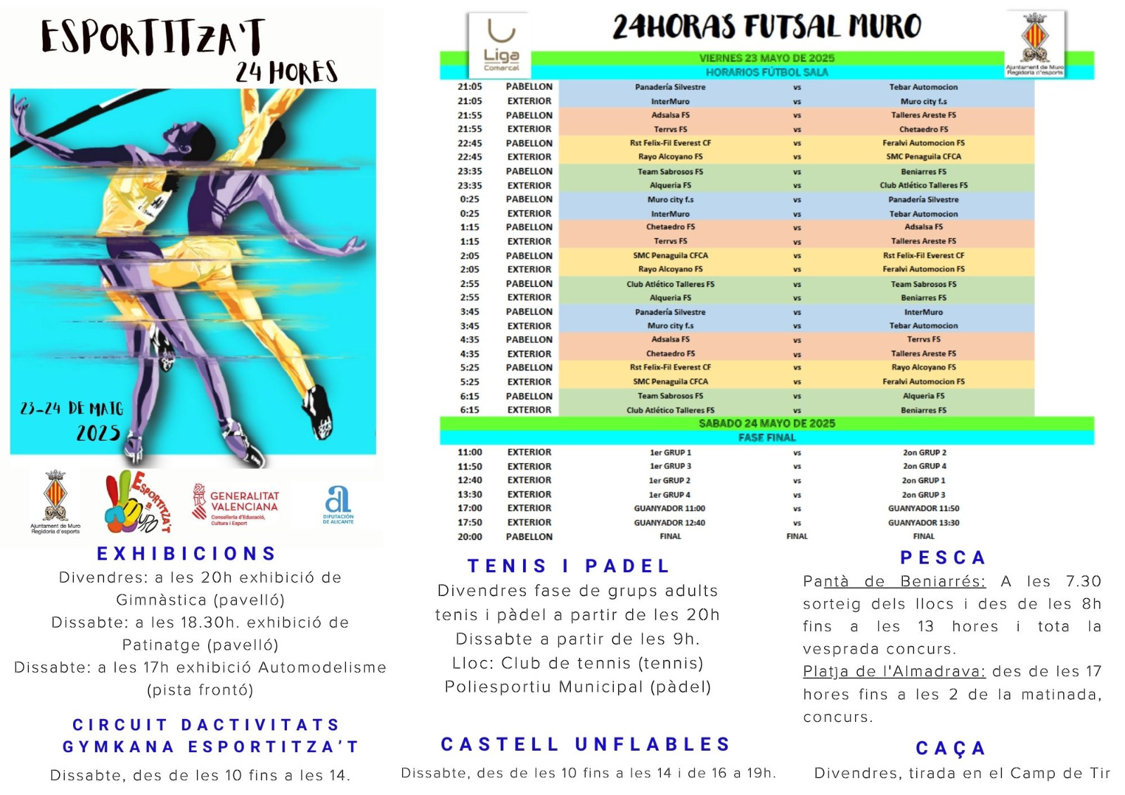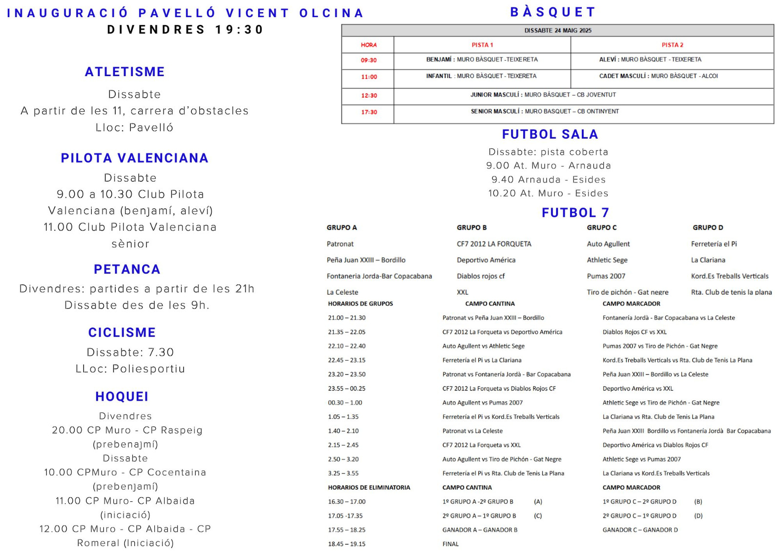 El dissabte l’agenda arranca a les 7:30h al Poliesportiu amb una intensa programació que inclou esports diversos com: atletisme, carrera d’obstacles, partides de pilota valenciana en categories infantils i sènior, així com una completa jornada de futbol 7, amb equips repartits en quatre grups i eliminatòries a la vesprada. A més, els diferents equips del Muro Bàsquet disputaran partits en categories des de benjamí fins a sènior, davant rivals com Teixereta, Alcoi, CB Joventut o CB Ontinyent.