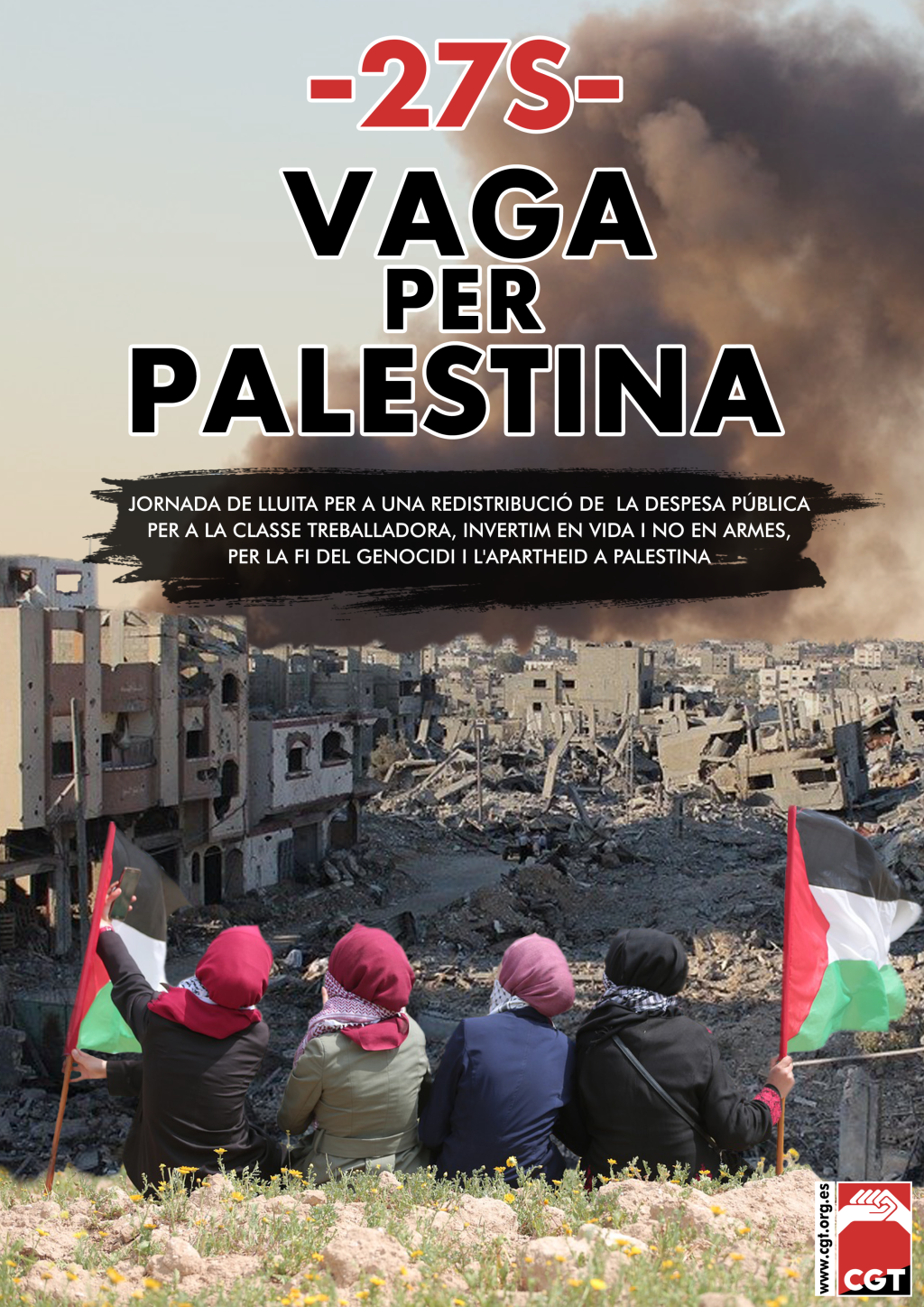 Contra la complicitat de les nostres institucions i governs, i atenent la crida dels treballadors i treballadores palestines, convoquem una jornada de lluita i vaga general el dia 27 de setembre.