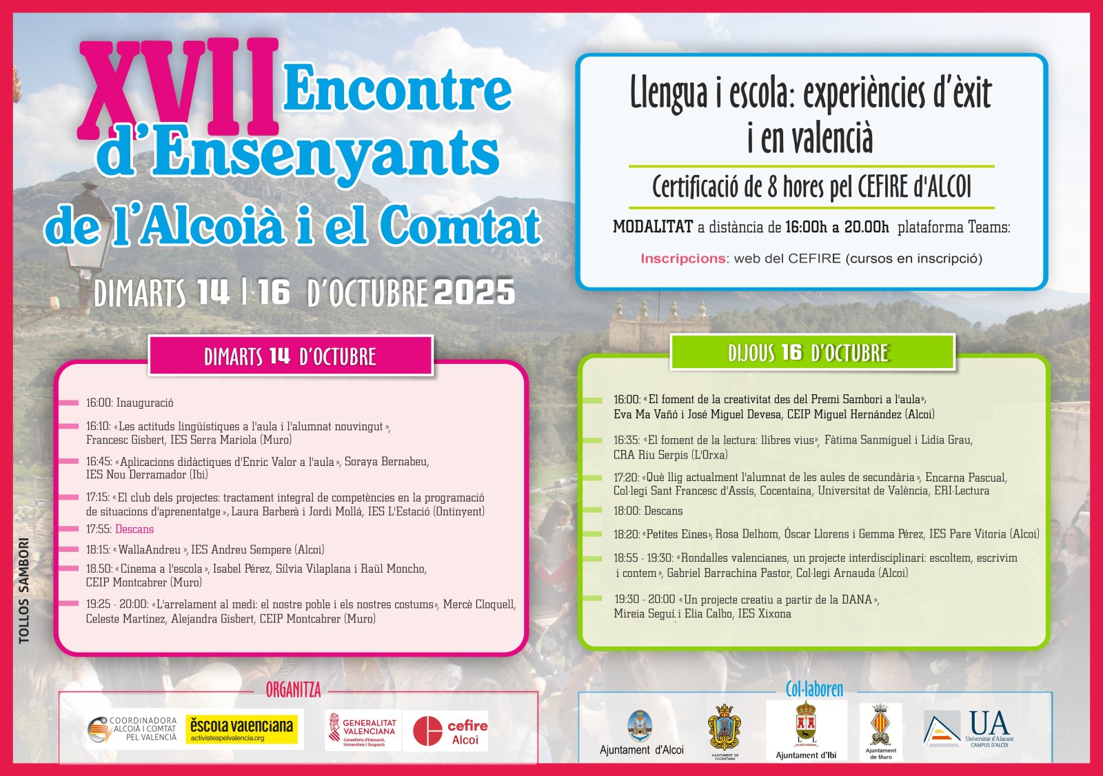 Enguany el lema és 'Experiències educatives d'èxit i en valencià', i està organitzat per la Coordinadora pel Valencià en col·laboració amb el CEFIRE d'Alcoi. Hi haurà xarrades sobre projectes que es fan a col·legis i instituts d'Alcoi, Muro, l'Orxa o Xixona.