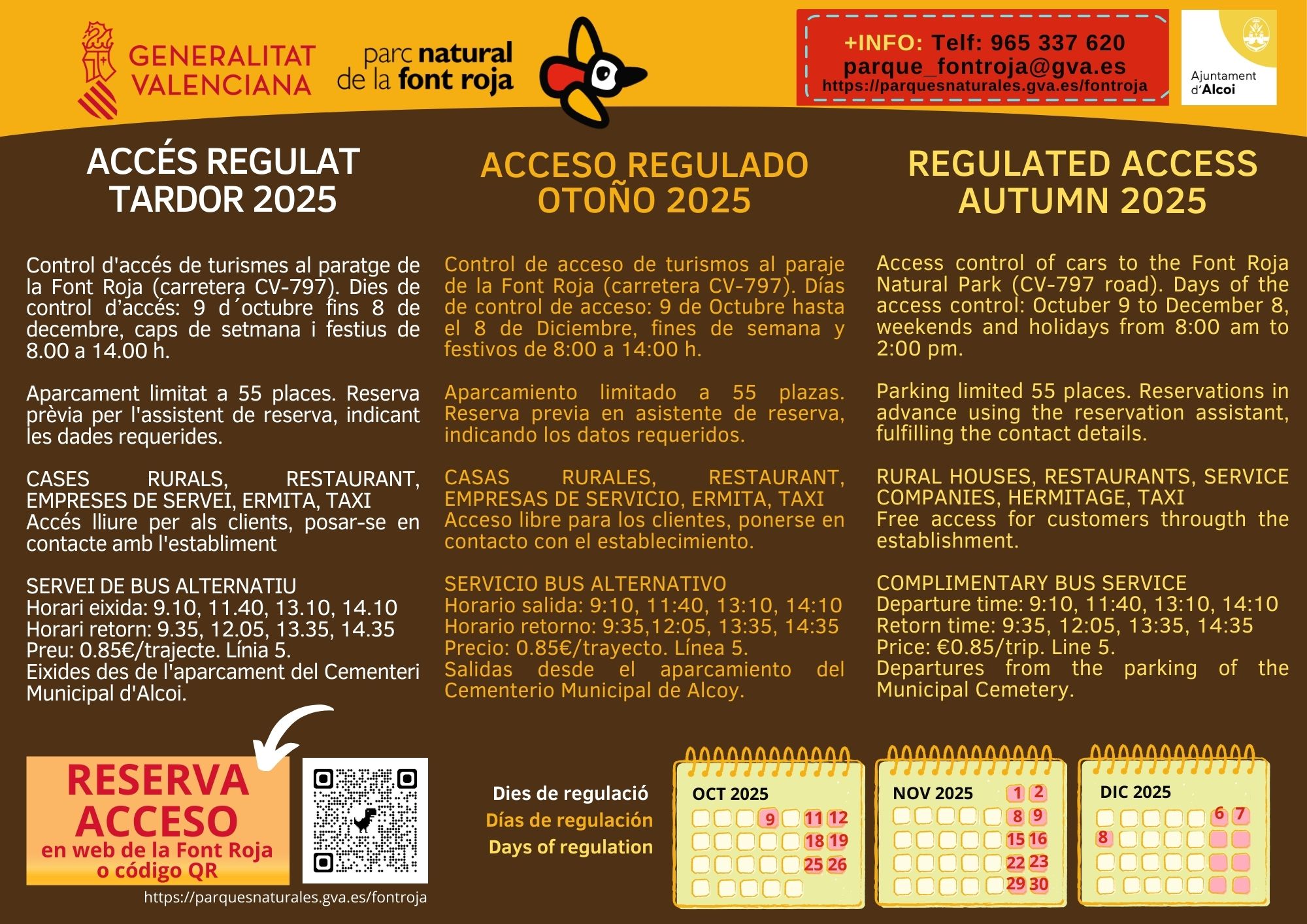 Com cada any quan s'inicia la tardor, torna a activar-se la regulació d'accés al parc natural de la Font Roja. Poc després del poliesportiu està la barrera que es baixarà tots els caps de setmana i festius des del 9 d'octubre i fins al 8 de desembre. La barrera estarà baixada de 8 a 14 hores.