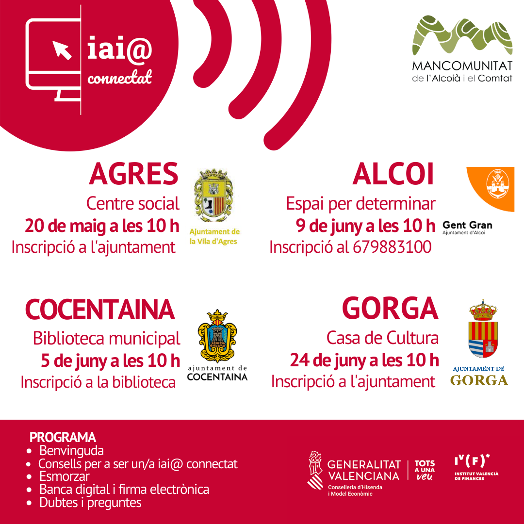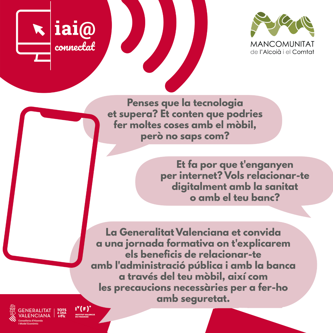 La Mancomunitat de l'Alcoià i Comtat ha posat en marxa una sèrie de tallers de digitalització, per tal d'aprendre rutines que ja són bàsiques com comprar en una tenda en línia, fer gestions en l'administració, tractar amb la banca digital, o utilitzar la signatura electrònica. Els tallers els finança l'IVF, l'institut valencià de finances; i impartit per l'equip de la Facultat d'Economia de la Universitat de València.