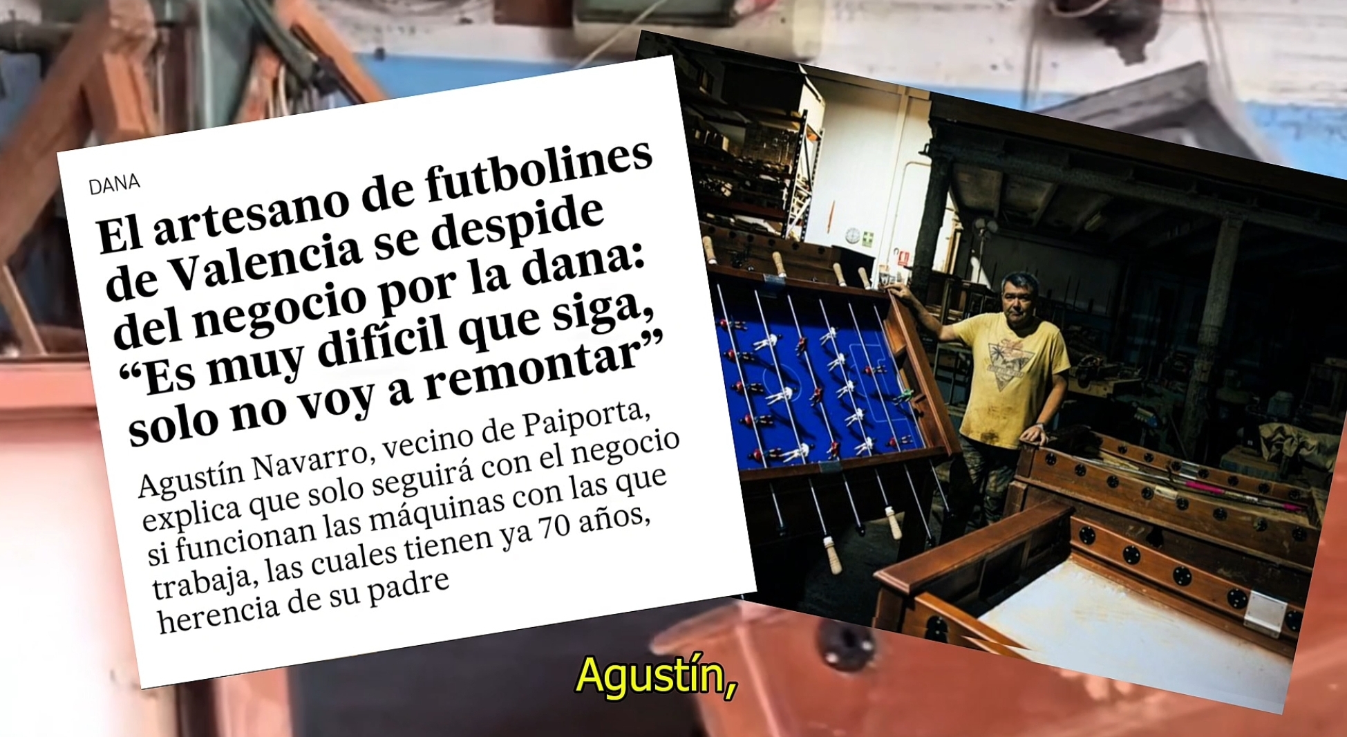Agustín Navarro és un dels 4 únics artesans que fan futbolins a mà a tota Espanya, i l'únic de la Comunitat Valenciana. Té el seu taller a Paiporta, i es va vore greument afectat per la DANA. Des de les Carmelites Vedruna d'Alcoi volen ajudar a la seua recuperació, i per això han encetat el projecte 'Agustín, fes-nos un futbolí'.
