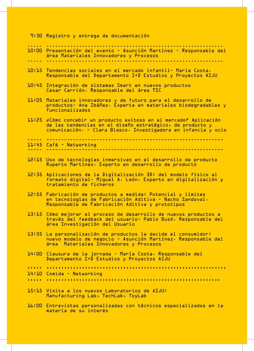 Baix ta el títol "El futur del desenvolupament de producte; personalització, Tecnologia i Mercat", representants del departament R+D Estudis i Projectes d'AIJU i les àrees de "User", "TIC" i "Materials Innovadors i Processos", explicaran com es pot disposar d'un coneixement pioner sobre les tendències del mercat i la seua aplicació en el disseny estratègic de producte.