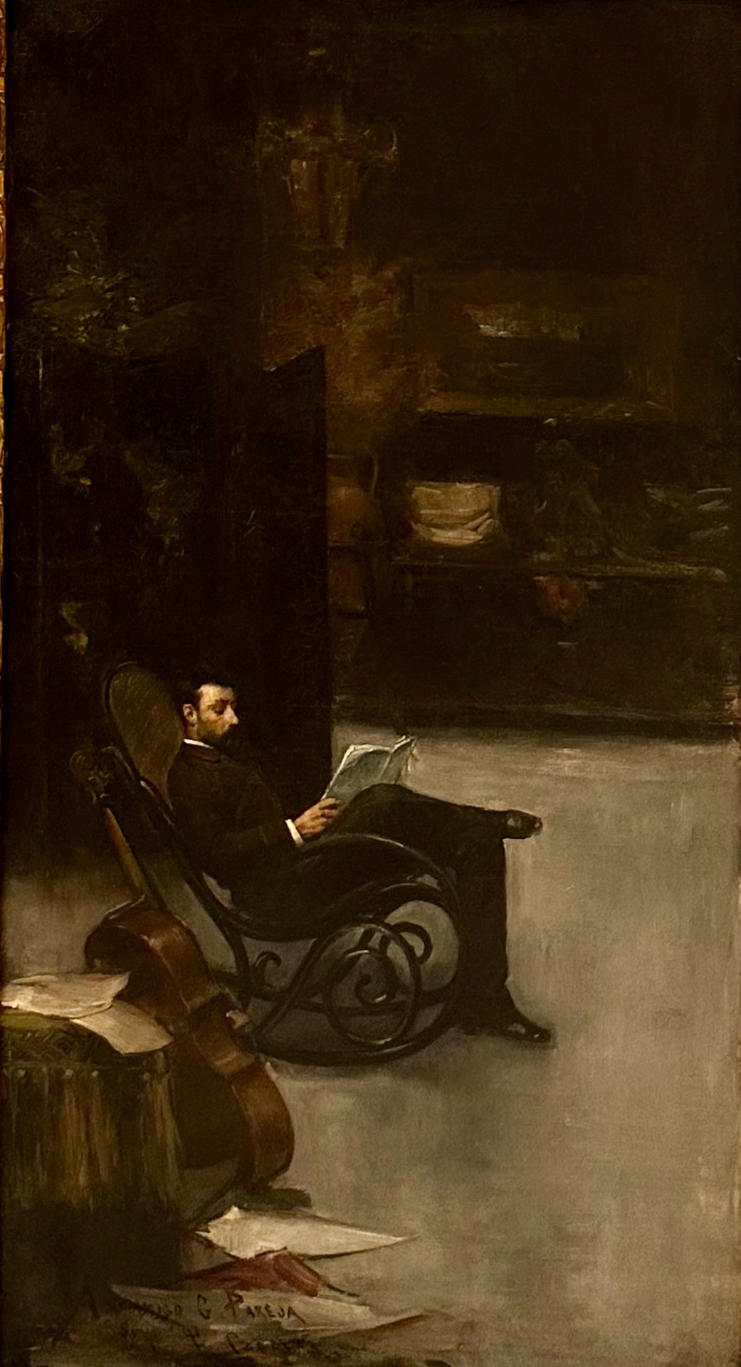 El quadre representa un home assegut en una cadira de balancí, concentrat en una partitura que possiblement siga del seu amic, ja que les que hi ha en terra estan signades amb el nom del músic. És "un ambient íntim que probablement correspon a l'antic estudi de la mistera del propi Cabrera". Des del consistori destaque el caràcter personal i evocador de l'escena, "el domini del clarobscur, la serenitat de l’escena i la delicadesa en la representació transmeten amb força l’univers artístic de Cabrera i la seua capacitat per capturar moments d’intimitat i contemplació".