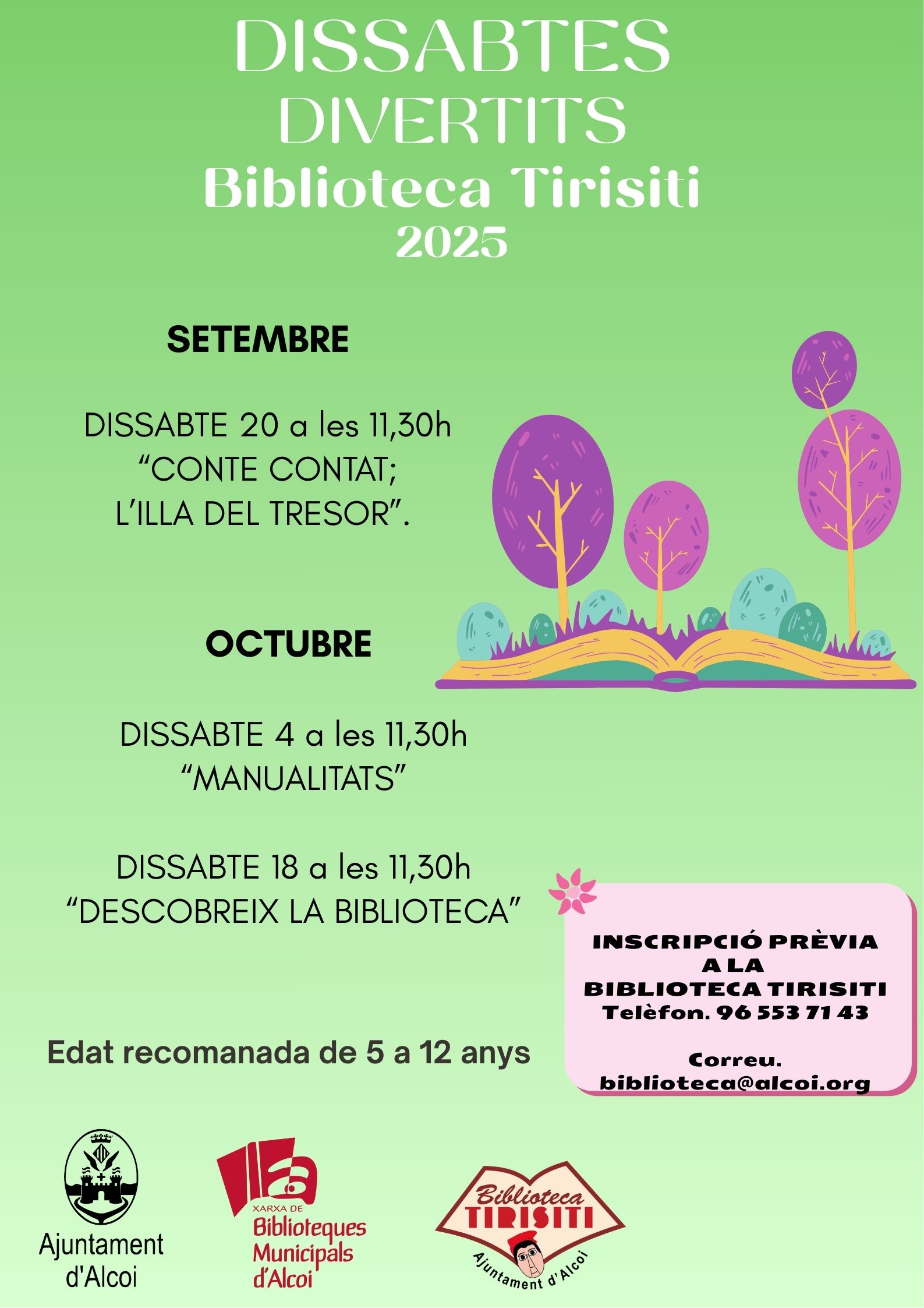 El calendari inclou tres sessions a les 11.30 hores: el 20 de setembre amb Conte contat: L’Illa del Tresor, el 4 d’octubre amb un taller de manualitats i el 18 d’octubre amb Descobreix la biblioteca, una activitat que ajudarà els més menuts a familiaritzar-se amb els racons i recursos de la Biblioteca Tirisiti.