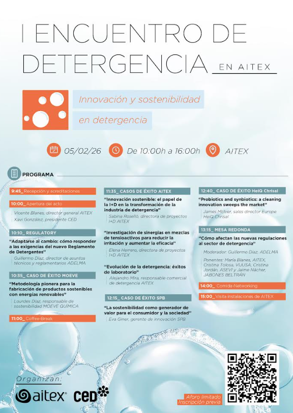 L'organitzen AITEX i el Comité Espanyol de Detergència, i al llarg de la jornada es compartiran els avanços en formulacions, l'evolució de la normativa europea o els criteris de sostenibilitat que condicionen els nous productes.
