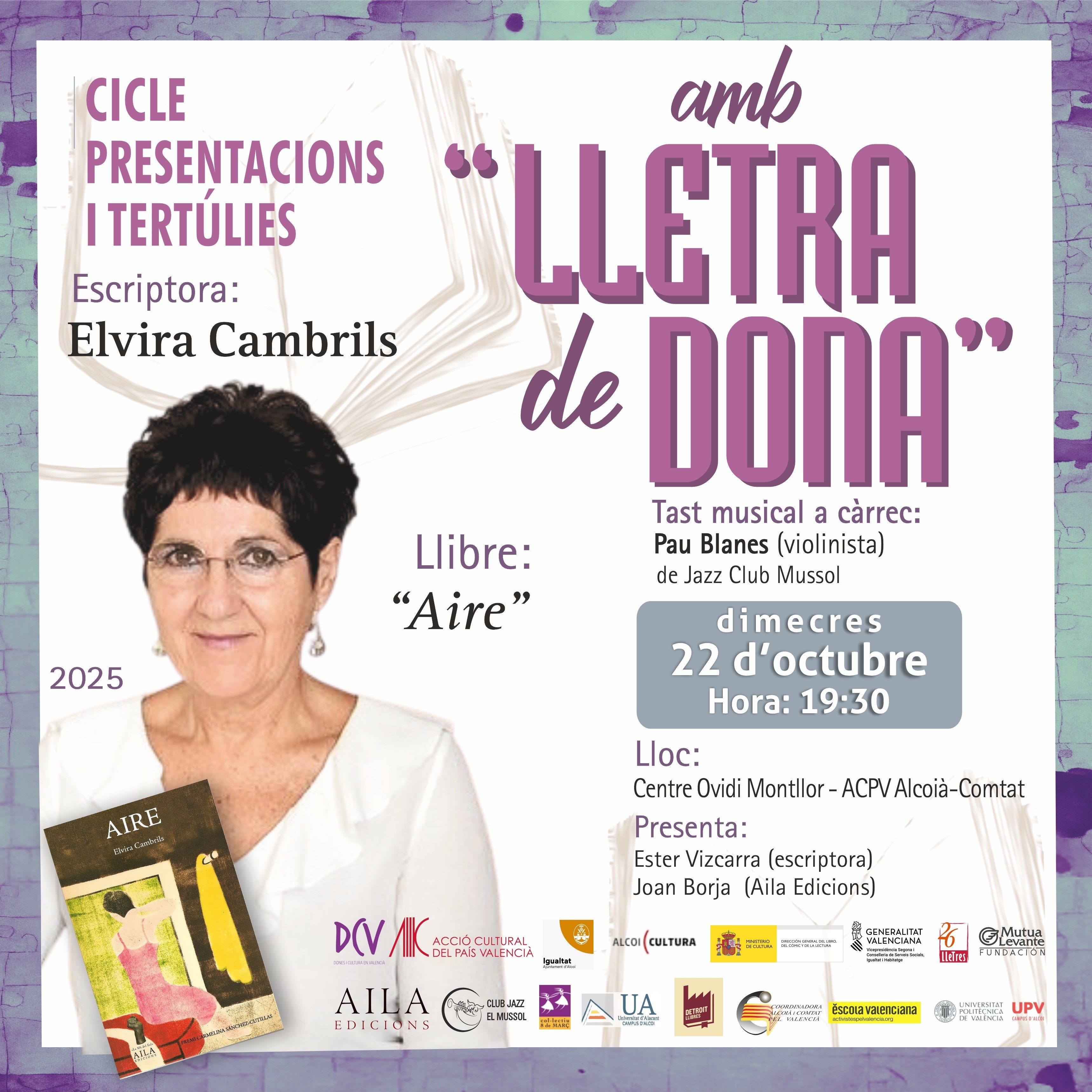 L’escriptora Elvira Cambrils presenta a Alcoi la seua novel·la ‘Aire’. Ho fa aquest 22 d’octubre a les 19:30h al Centre Ovidi Montllor. L’esdeveniment comptarà amb l’acompanyament de l’escriptora alcoiana Ester Vizcarra, l’editor i escriptor Joan Borja i el violinista Pau Blanes, del Jazz Club Mussol, qui posarà música a l’acte.