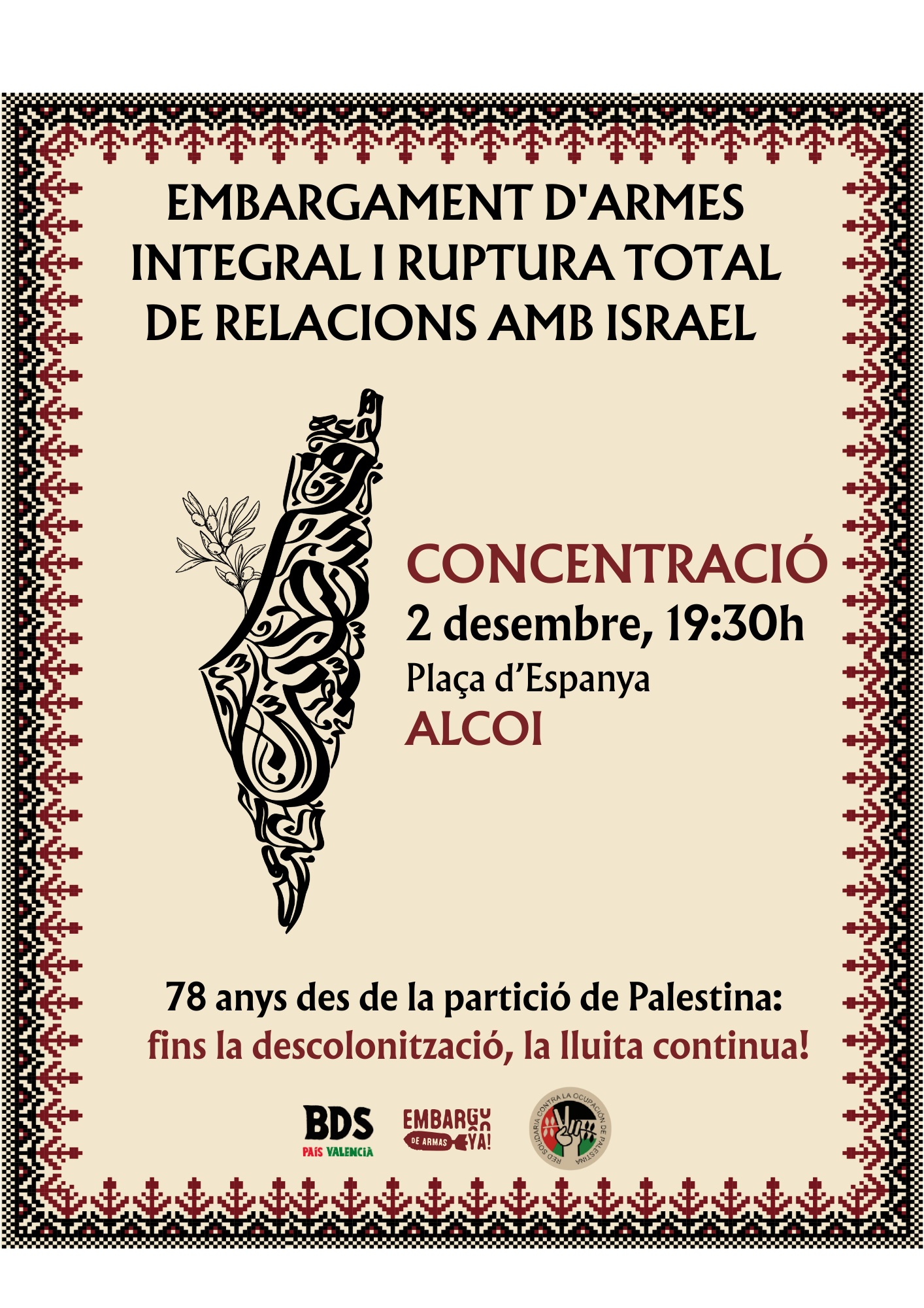 Alcoi torna a eixir al carrer el dimarts 2 de desembre, a les 19.30 hores, a la plaça d’Espanya, en una nova concentració en suport al poble palestí. La convocatòria denuncia la persistència d’un conflicte que, segons els organitzadors, arrossega dècades d’injustícies des del Pla de Partició de l’ONU de 1947, que identifiquen com l’inici de la Nakba i de la vulneració dels drets del poble palestí.