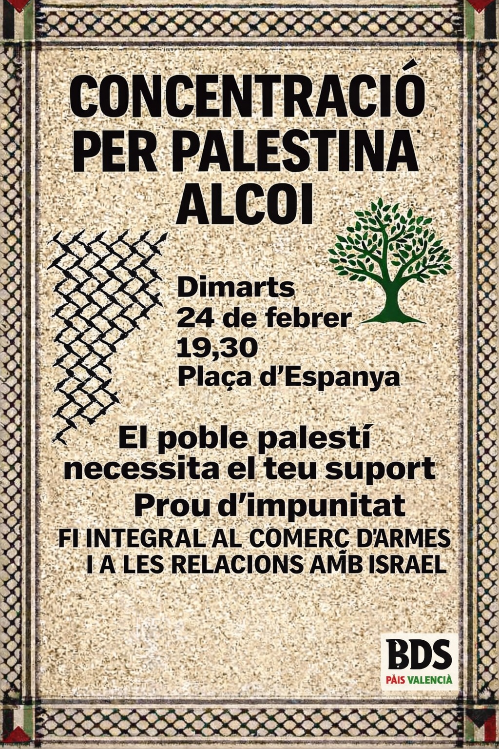 La convocatòria fa una crida a la ciutadania d’Alcoi i de les comarques a participar en aquesta acció reivindicativa per mostrar solidaritat i reclamar una solució basada en la justícia i els drets humans.
