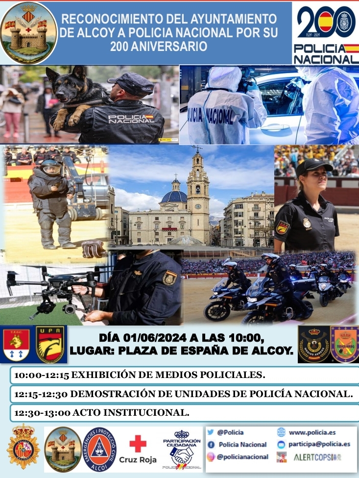 L'any 1824 el rei Fernando VII va promulgar la Real Cèdula per la qual es creava la Policia General del Regne, l'antecedent històric de l'actual Policia Nacional. El cos de seguretat celebra el seu dos-cents aniversari amb diferents actes arreu tot el territori espanyol, i també a Alcoi, amb una exhibició de mitjans policials este dissabte 1 de juny.