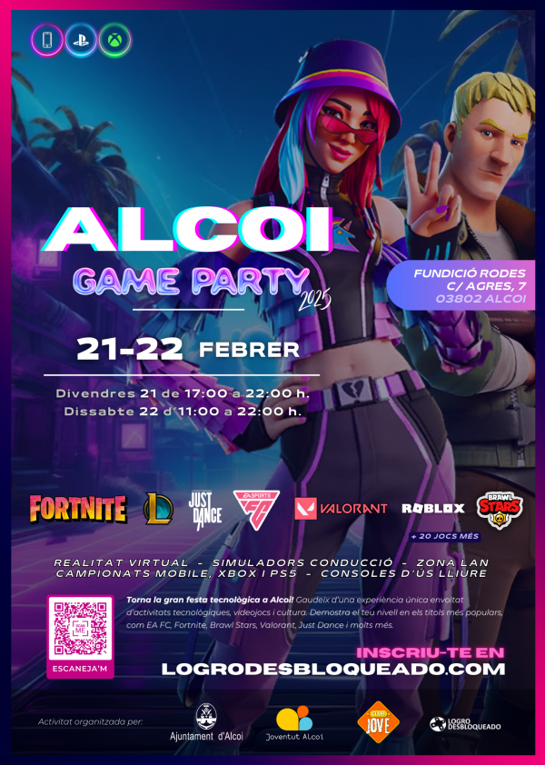 Fortnite, Brawl Stars, l'EA FC, Just Dance, League of Legends... Són tan sols alguns dels títols que podran jugar-se en la primera Game Party que celebra Alcoi, on també hi haurà simuladors, zona WiFi, zona LAN, zona ARCADE i quioscos oficials de Microsoft i Sony.