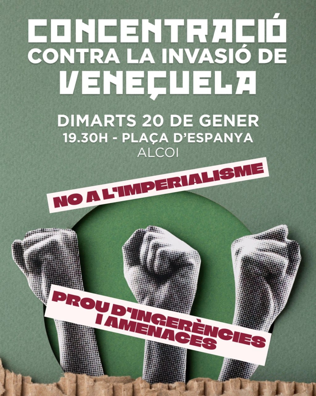 Fa unes setmanes el president d’EEUU va detenir al president de Veneçuela, Nicolás Maduro, acusant-lo de narcotràfic. Davant aquest fets i les amenaces d’intervenció i ingerències externes, Alcoi ha convocat una concentració per defensar “el dret a decidir, la sobirania i la pau”.