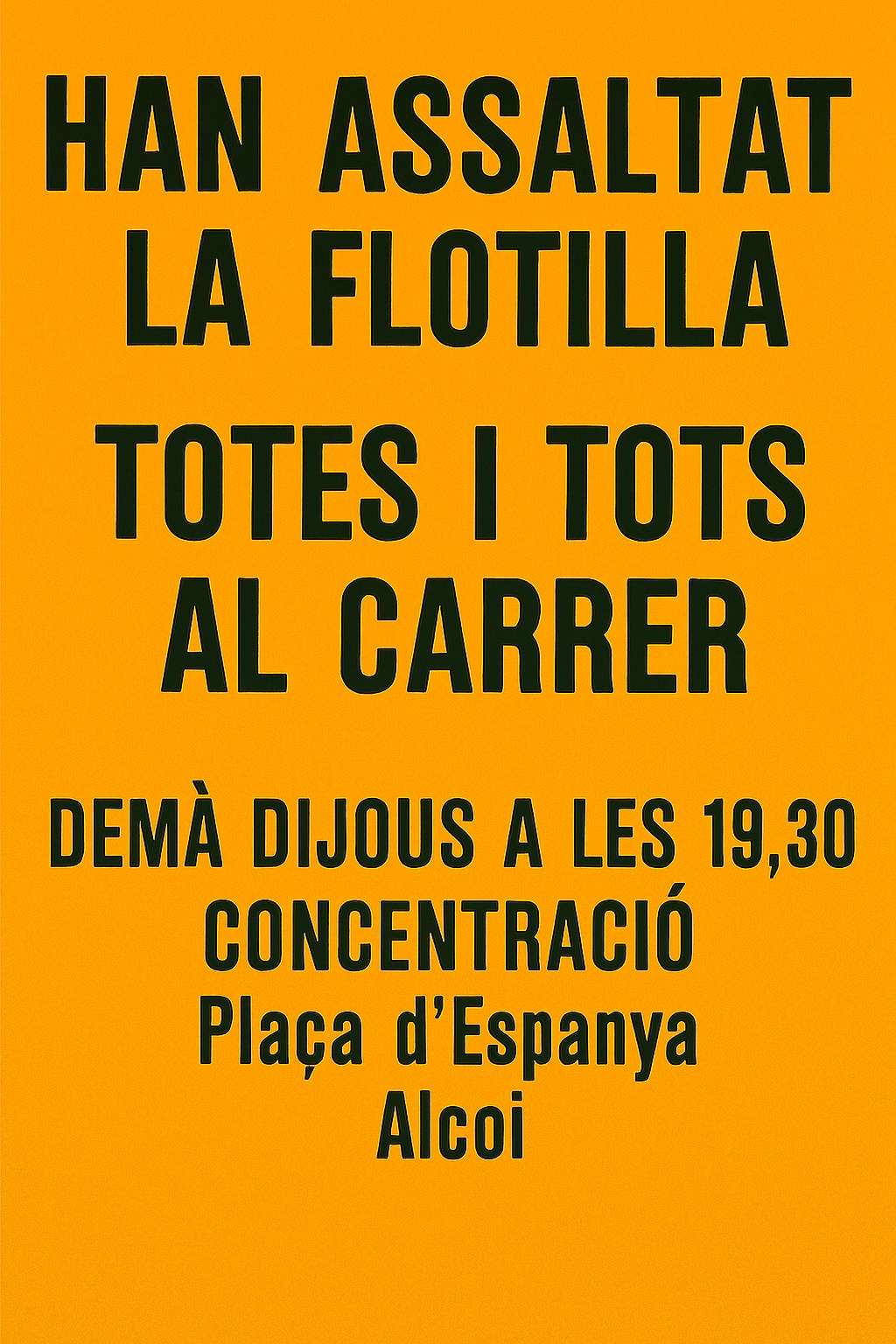 Després de la notícia de l'assalt, per part d'Israel, de la coneguda com a "flotilla de la llibertat", que es dirigia a Gaza amb l'objectiu d'obrir un corredor humanitari, moltes ciutats espanyoles han convocat concentracions per tal de mostrar el seu rebuig. Una d'elles és Alcoi que, fins ara, ha acollit diferents manifestacions a favor de Gaza i en contra del genocidi. La concentració tindrà lloc este dijous 2 d'octubre a les 19:30 en la plaça d'Espanya, com és habitual en aquestes manifestacions.