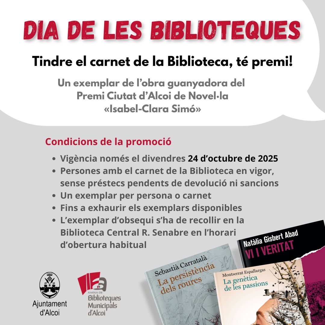 Alcoi se suma aquest 24 d’octubre a la celebració del Dia de les Biblioteques i ho fa entregant de manera gratuïta exemplars de les novel·les guanyadores del Premi Ciutat d’Alcoi “Isabel-Clara Simó”.