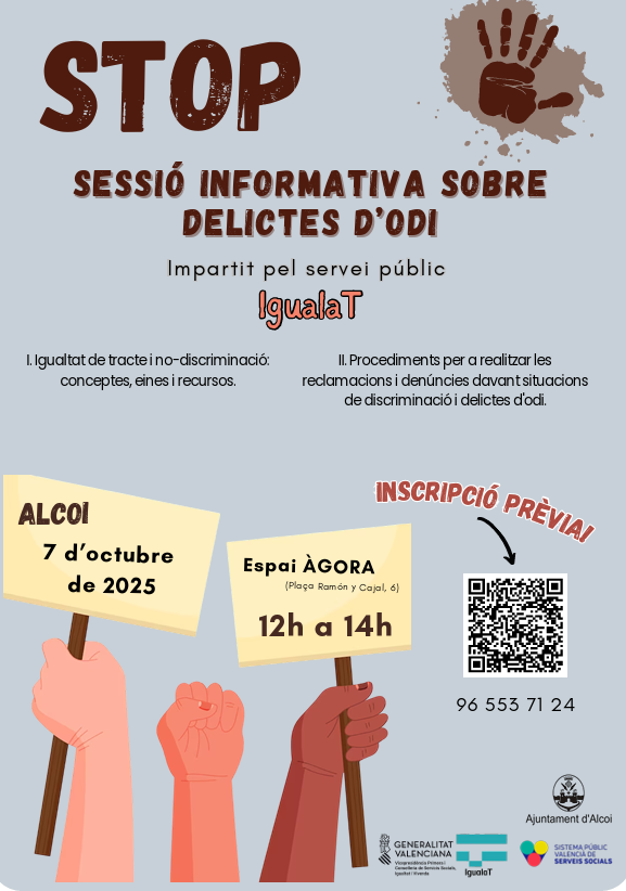 L’Ajuntament d’Alcoi ha organitzat aquest 7 d’octubre una sessió informativa que té l’objectiu de previndre, identificar i denunciar els delictes d’odi. L’esdeveniment és de 12 a 14h i està dirigit tant als funcionaris com als estudiants i població general.