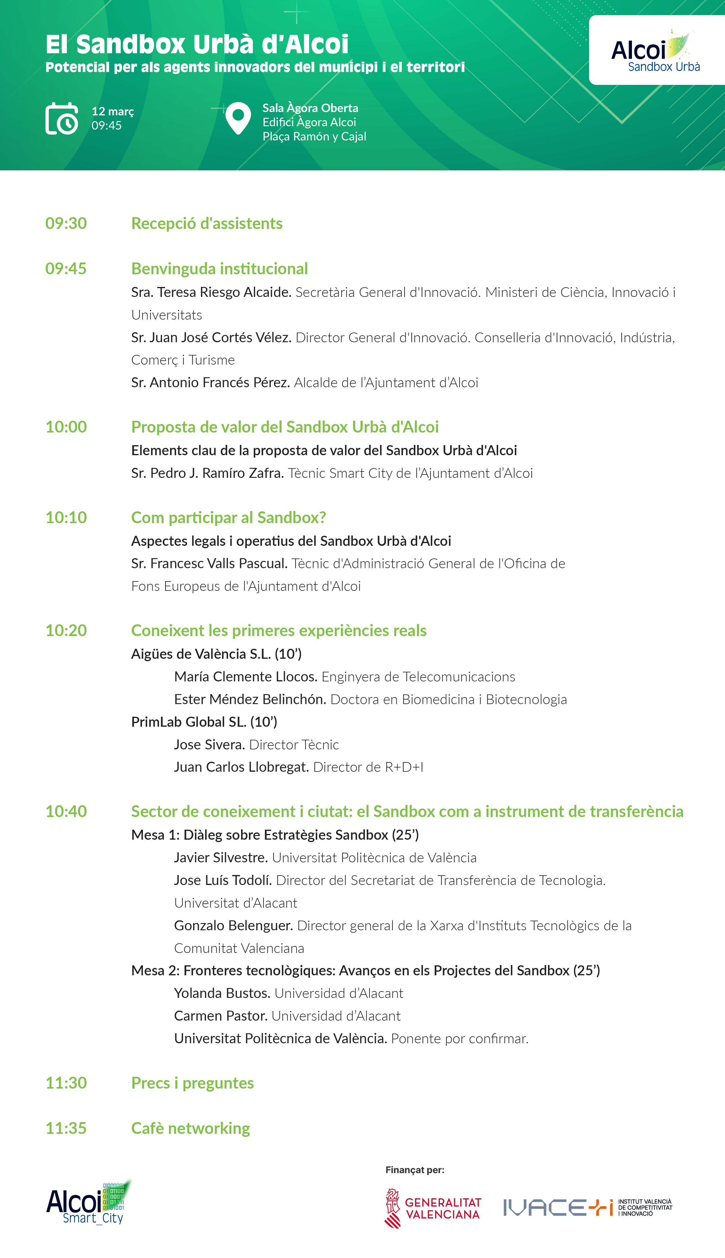 Durant la jornada, s'oferiran les claus sobre què és, què suposa i quins objectius persegueix el Sandbox Urbà d'Alcoi. També s’explicarà el procés per a entrar a formar part d'ell i s'explicarà com funciona. A la jornada participaran Aigües de València S.L. o Primlab, S.L. narrant les seues experiències. En acabar la sessió, dissenyada de manera presencial, hi haurà un espai de ‘networking’ per a tots els assistents. Per a participar, cal fer la inscripció a través d’aquest enllaç.