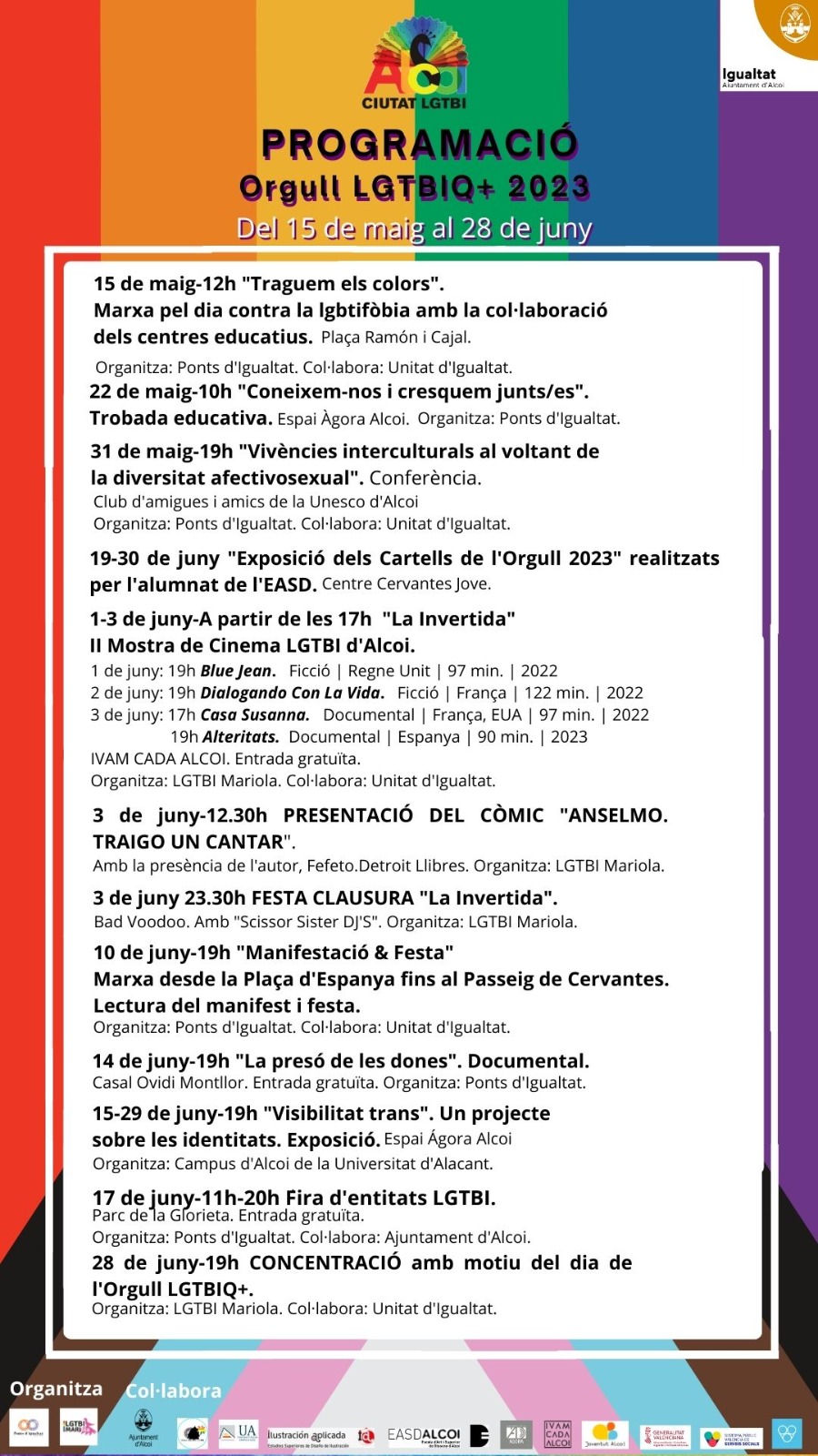 Al llarg de tot un mes hi haurà cinema, exposicions, xarrades o formació, amb la manifestació i festa per la Diversitat el 10 de juny. Els col·lectius demanen que s'instaure la segona setmana de juny per a celebrar sempre l'Orgull a Alcoi.
