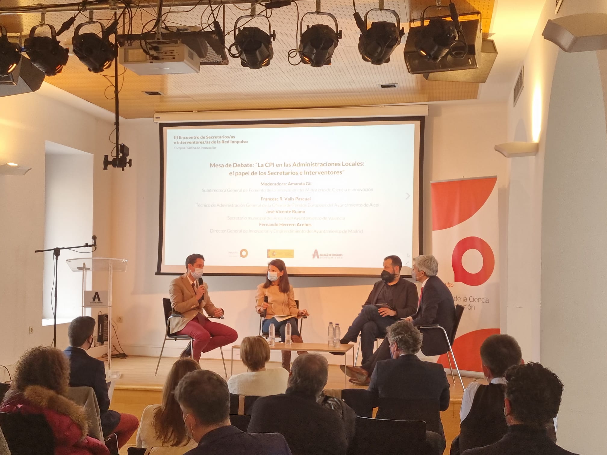 La regidora de Contractació, Lorena Zamorano, junt Francesc R. Valls Pascual, Tècnic d’Administració General de l’Oficina de Fons Europeus de l’Ajuntament d’Alcoi, van assistir a la jornada en la qual el citat T.A.G. va participar com a ponent en la taula de debat titulada: “La CPI en les Administracions Locals: el paper dels secretaris i interventors”, que va estar moderada per la subdirectora General. S. G. de Foment de la Innovació del Ministeri de Ciència i Innovació; Amanda Gil i en la qual també van intervindre el secretari municipal de l’Àrea Il de l’Ajuntament de València; José Vicente Ruano i el director general d’Innovació i Emprenedoria de l’Ajuntament de Madrid; Fernando Herrerom Acebes.