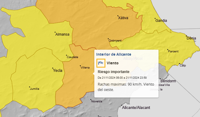 L’Agència Estatal de Meteorologia (AEMET) ha decretat alerta taronja per risc de fortes ràfegues de vent a l’interior nord de la província d’Alacant. Aquestes poden afectar a municipis de L’Alcoià o, també, a Xixona.