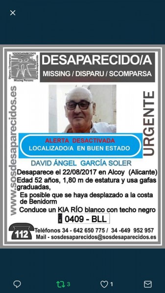 Alerta desactivada en la desaparició de David Ángel García Soler, l'home de 52 anys, que va desaparèixer el dia 22 d'agost ha sigut trobat, després de 4 dies desaparegut, en bon estat.