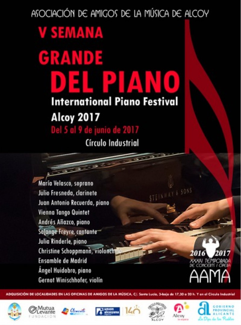 Alcoi torna a ser l'epicentre de la música gràcies a la V Setmana Gran del Piano que organitza Amics de la Música d'Alcoi (AAMA) entre el dilluns 5 i el divendres 9 de juny. Els artistes venen des d'Austria o Alemanya i, també, estaran artistes alcoians. Cal destacar que té un caire benèfic i la recaptació anirà destinada a la Fundació de l'Hogar Infantil d'Alcoi. Les entrades es poden adquirir a les oficines d'AAMA en el Carrer Santa Llúcia, 3 o en el Círculo Industrial.