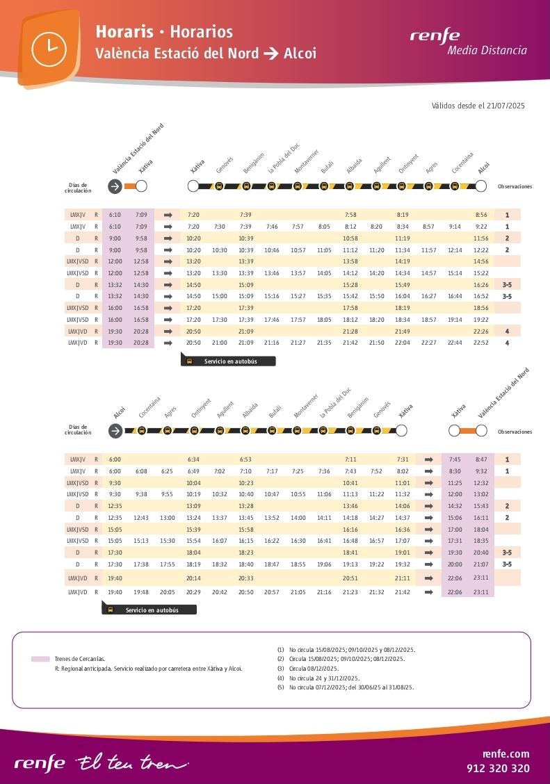 Recordeu que el viatge es fa en autobús perquè durant el pròxim any i mig les vies estan en obres. Els nous horaris entraran en vigor este dilluns 21 de juliol.