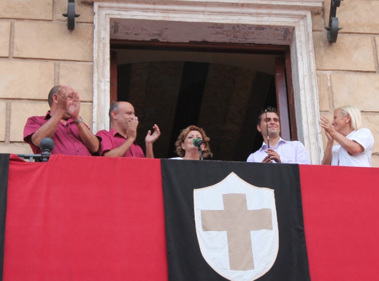 A les balconades del Palau Comtal ja esperaven les autoritats civils i festeres. Entre tots ells hem pogut vore a l'Alcalde de Cocentaina Rafa Briet, a la regidora de Festes Rosa Selles, a la Presidenta de la Junta de Festes Pepa Prats, al Director de l'Himne Bernardo Mur, i als quatre càrrecs festers: José Adolfo Vicent (Capità Cristià pel Contrabando), Gustavo Pascual (Capità Moro pels Bequeteros), Carlos Torrecillas (Abanderat Cristià pels Creuats) i Mateo Pérez (Abanderat Moro pels Mudèjars).