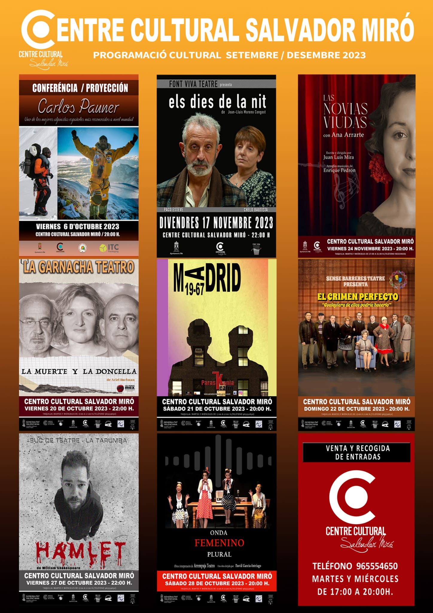 La venda i recollida d'entrades per a les actuacions que es realitzen en el Centre Cultural Salvador Miró es poden adquirir en les taquilles del centre, els dimarts i dimecres, de 17.00 h a 20.00 h. (965554650).