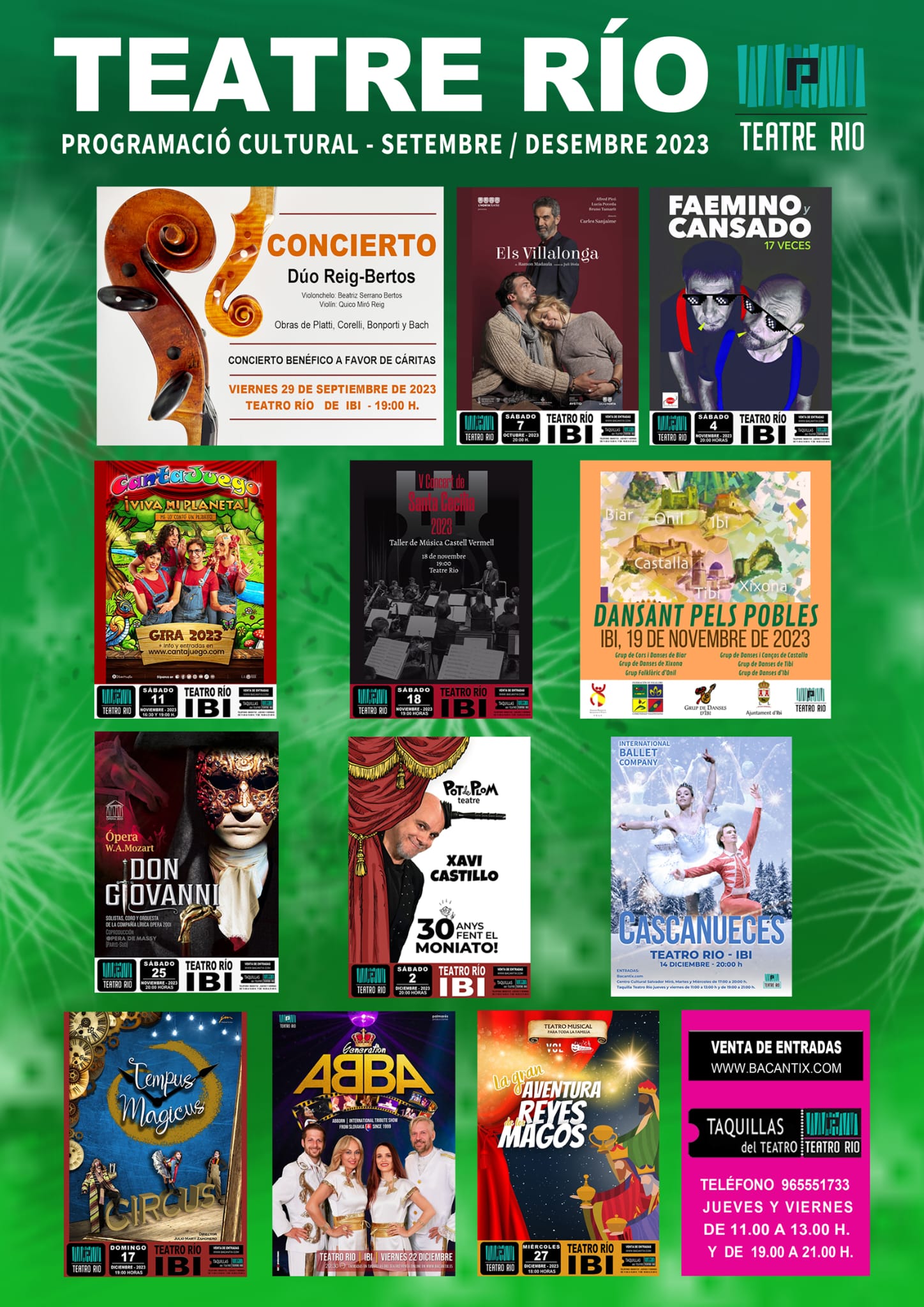 Paral·lelament, la programació del Teatre Riu, de setembre a desembre, inclou una variada oferta que comença amb el concert benèfic a favor de Càritas “Duo Reig-Bertos”, amb Beatriz Serrano Bertos al violoncel i Quico Miró Reig al violí, el divendres 29 de setembre, a les 19.00 h, en el Teatre Riu. A l'octubre , l'obra teatral “Els Vilallonga” trepitjarà els escenaris del teatre el dissabte 7, a les 20:00h.