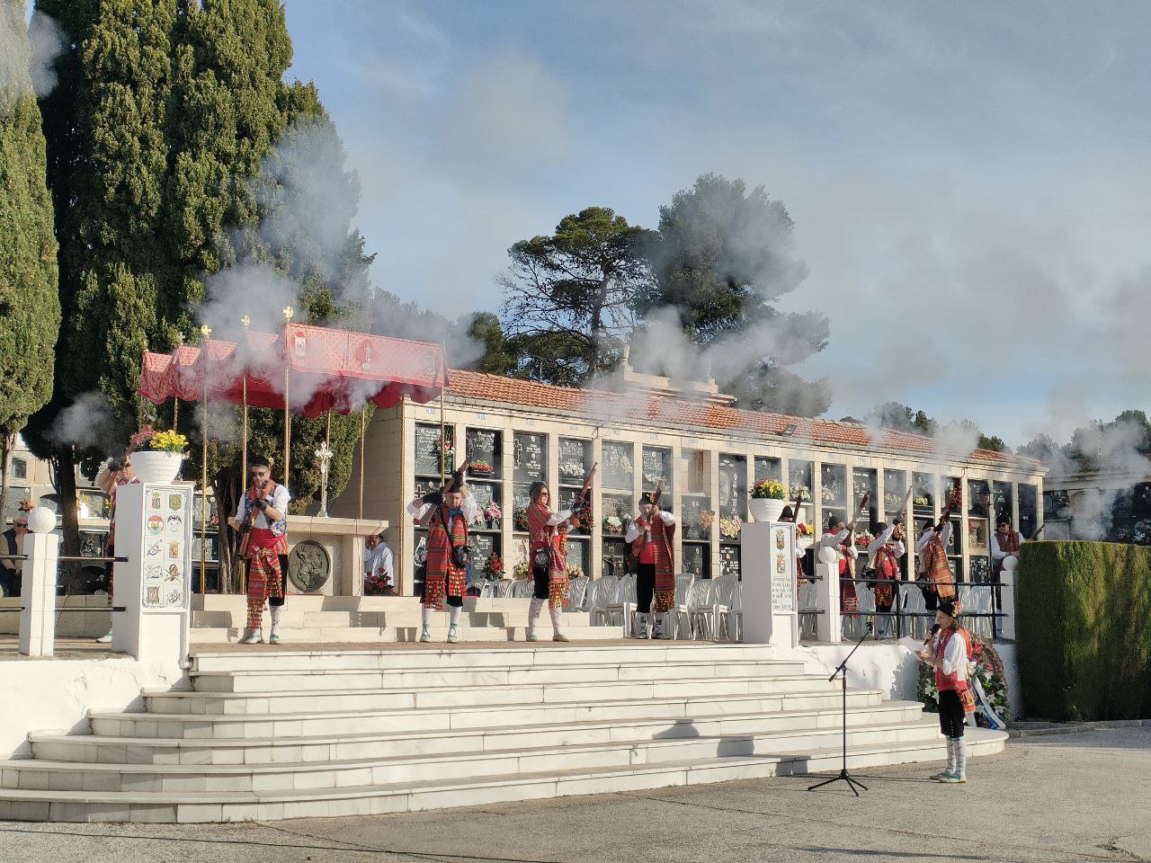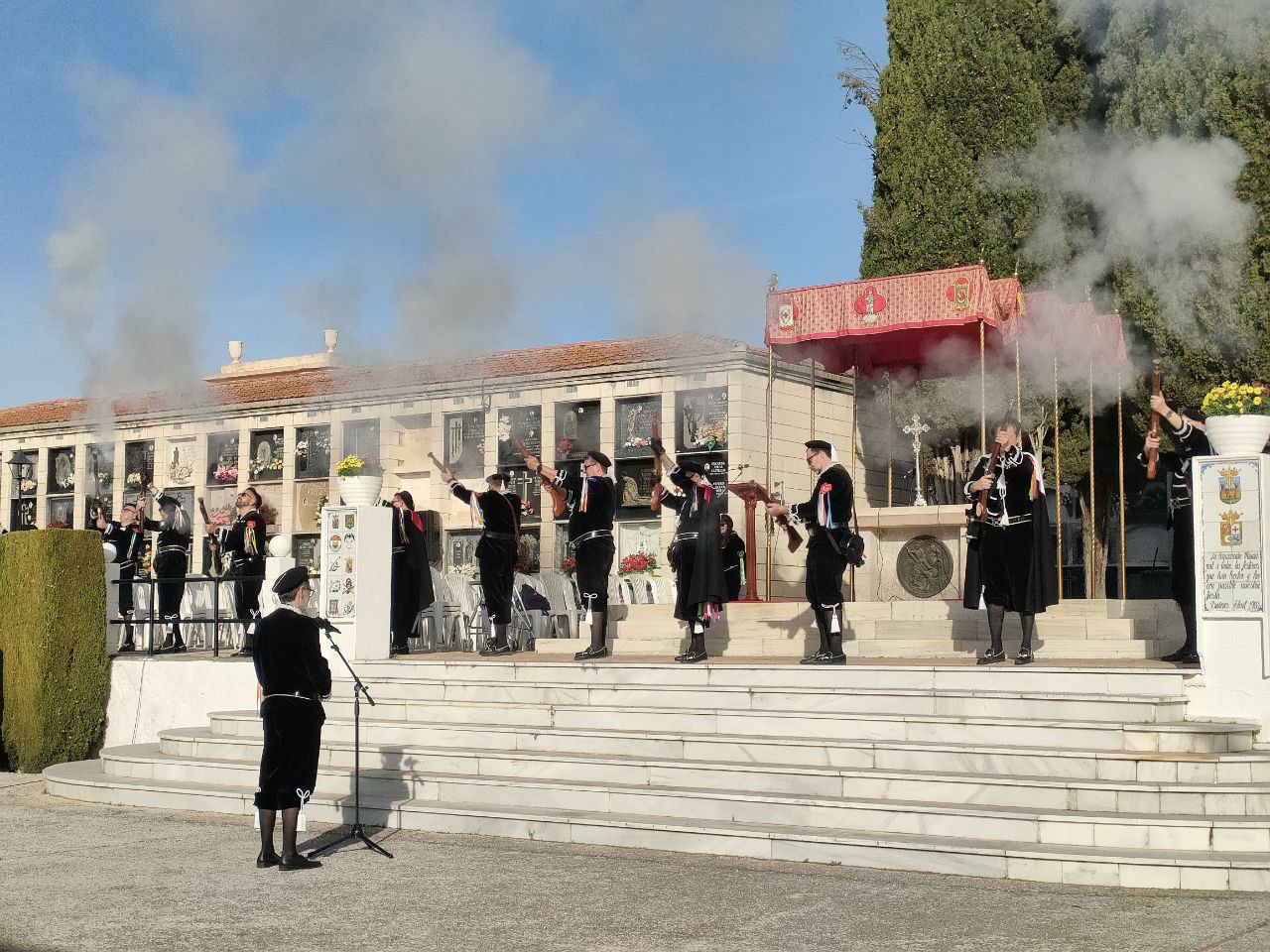 És un acte únic de Banyeres, on els festers i festeres disparen salves en el cementeri en record d'aquells que ja no estan.