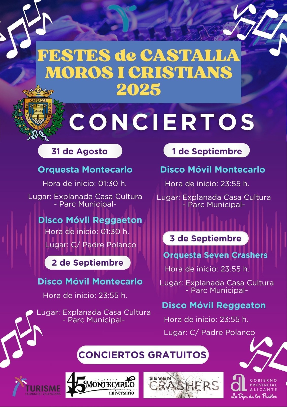 Del 31 d’agost i fins el 4 de setembre, Castalla celebra les Festes Majors de Moros i Cristians en honor a a la Patrona, la Mare de Déu de la Soledat. La participació aquest any superarà les 2.500 persones, que estan agrupades en les set comparses , quatre cristianes i tres mores.
