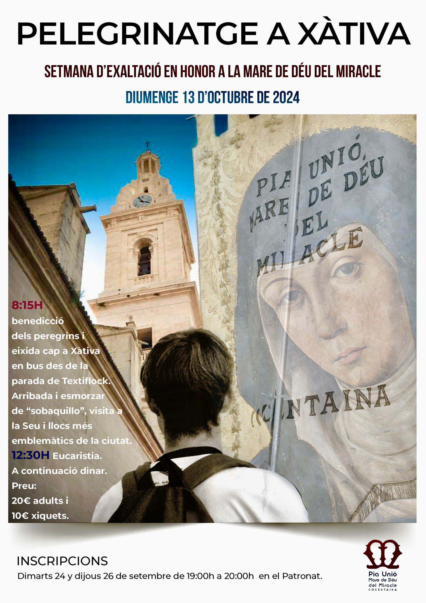 La peregrinació inclourà una visita als llocs més emblemàtics de Xàtiva i la celebració d’una Eucaristia a la Seu. El preu és de 20 euros per a adult i 10 per a xiquets i inclou viatge, entrades i dinar. Les inscripcions es podran realitzar el dimarts 24 i dijous 26 de setembre de 19h a 20h als locals del Patronat.