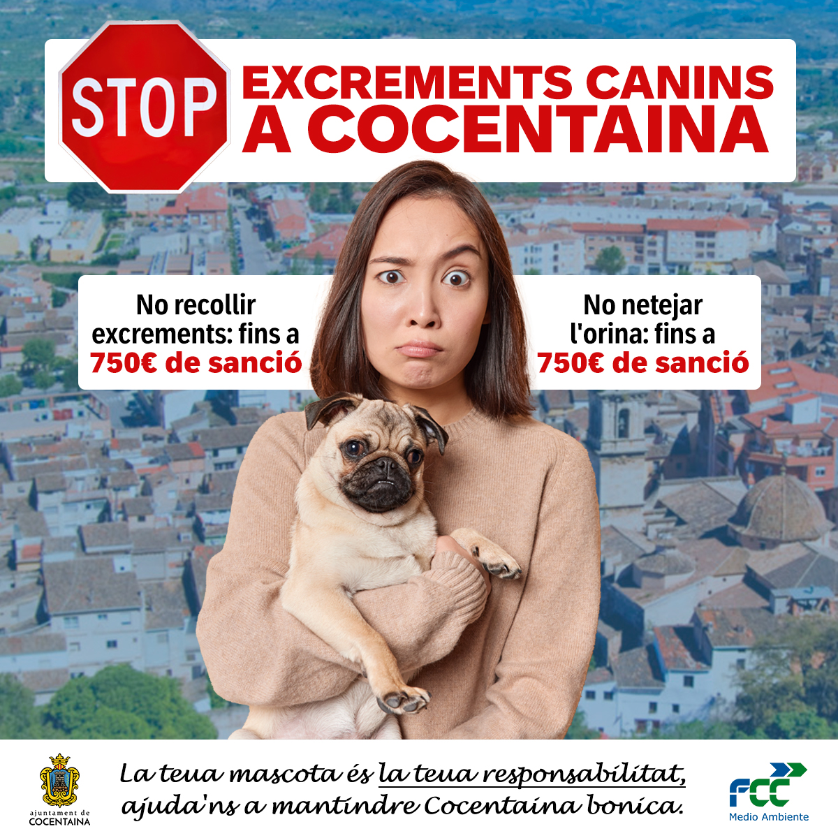 L'Ajuntament de Cocentaina fa una campanya per a recordar les sancions de fins a 750 euros per no arreplegar o netejar els excrements.