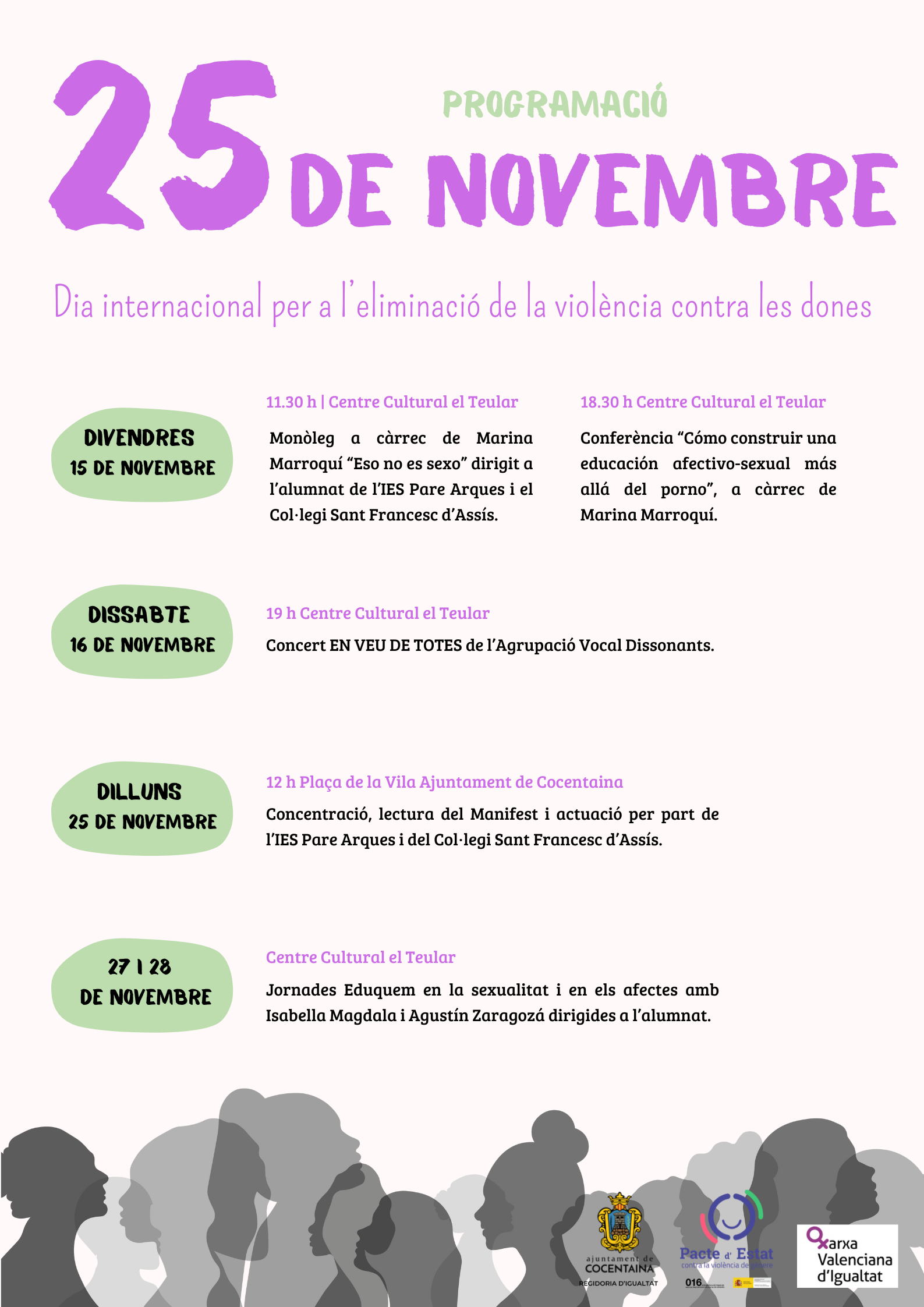 Les activitats es desenvolupen des d'aquest 15 de novembre fins el pròxim 27 i 28 de novembre. Els actes clua son el propi 25N amb la lectura del manifest i la participació dels centres educatius de secundaria.