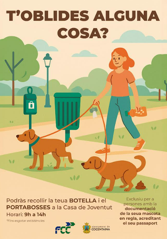 L’Ajuntament de Cocentaina acaba de llançar una campanya que té l’objectiu de conscienciar a veïns i veïnes amb mascotes en higiene viària. Per aquest motiu, es repartirà a la Casa de la Joventut de 9h a 14h, 2.000 porta bosses i botelles d’aigua a totes les persones que acrediten la documentació en regla de la mascota.