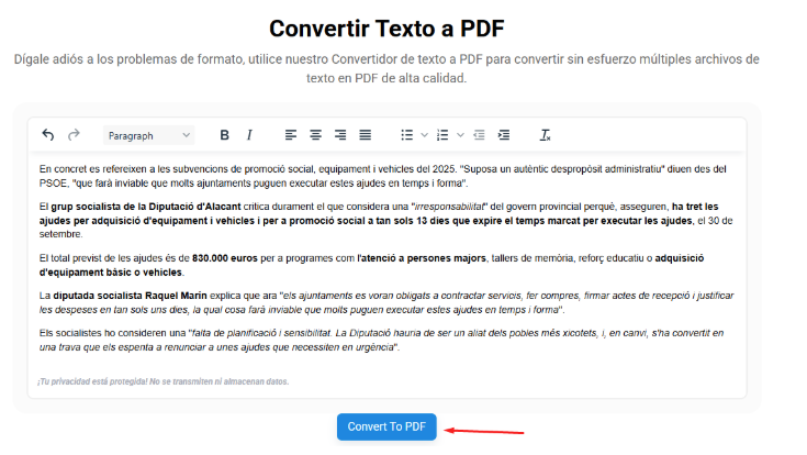 Per a aquesta entrada del bloc, també hem triat una eina que permet convertir text a PDF online amb un sol clic. Ofereix nombroses opcions de format, com ara afegir etiquetes d'encapçalament, negreta, cursiva i vinyetes/numeració.