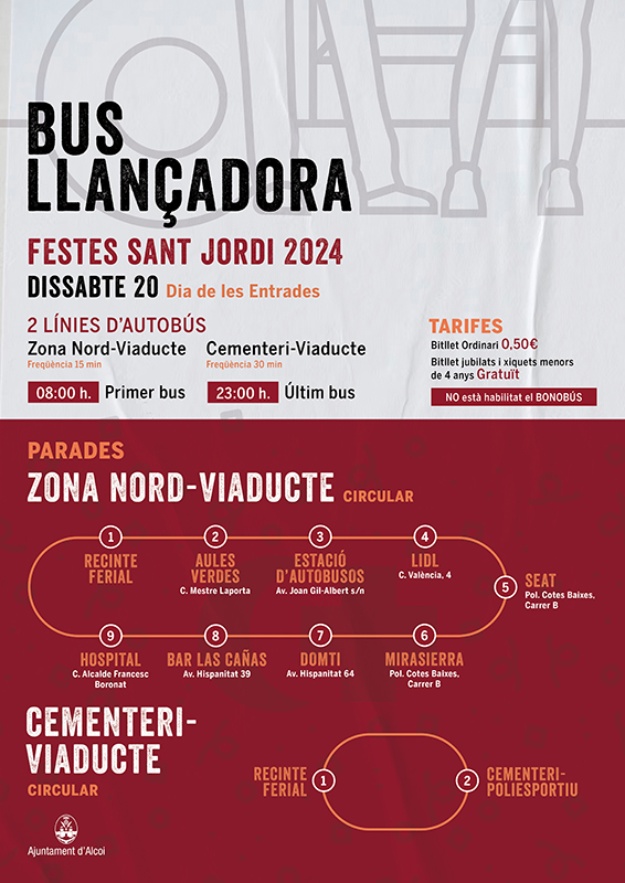 Com cada any, el dia de l'Entrada d'Alcoi es multiplica la població amb totes les visites que rebem de diferents parts d'Espanya i del món. I moltes d'estes visites venen el mateix dia amb el seu vehicle particular, però entrar al centre de la ciutat en cotxe, com saben, és impossible. És per això que l'Ajuntament organitza un servei d'autobús llançadora per a facilitar que els visitants puguen aparcar i apropar-se fins al centre de la ciutat.
