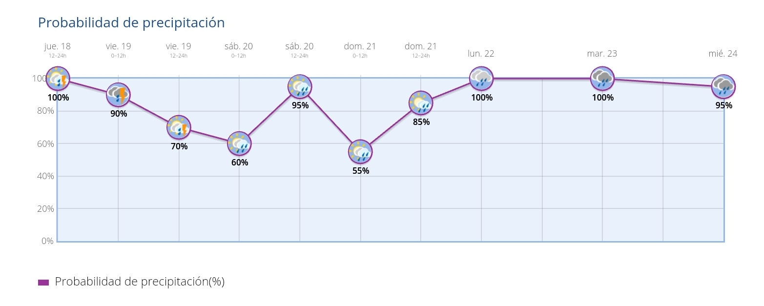 Segons les previsions d'AEMET per als pròxims dies, la probabilitat de pluja a Alcoi és elevada tots els dies, amb major intensitat a principis de la setmana pròxima.