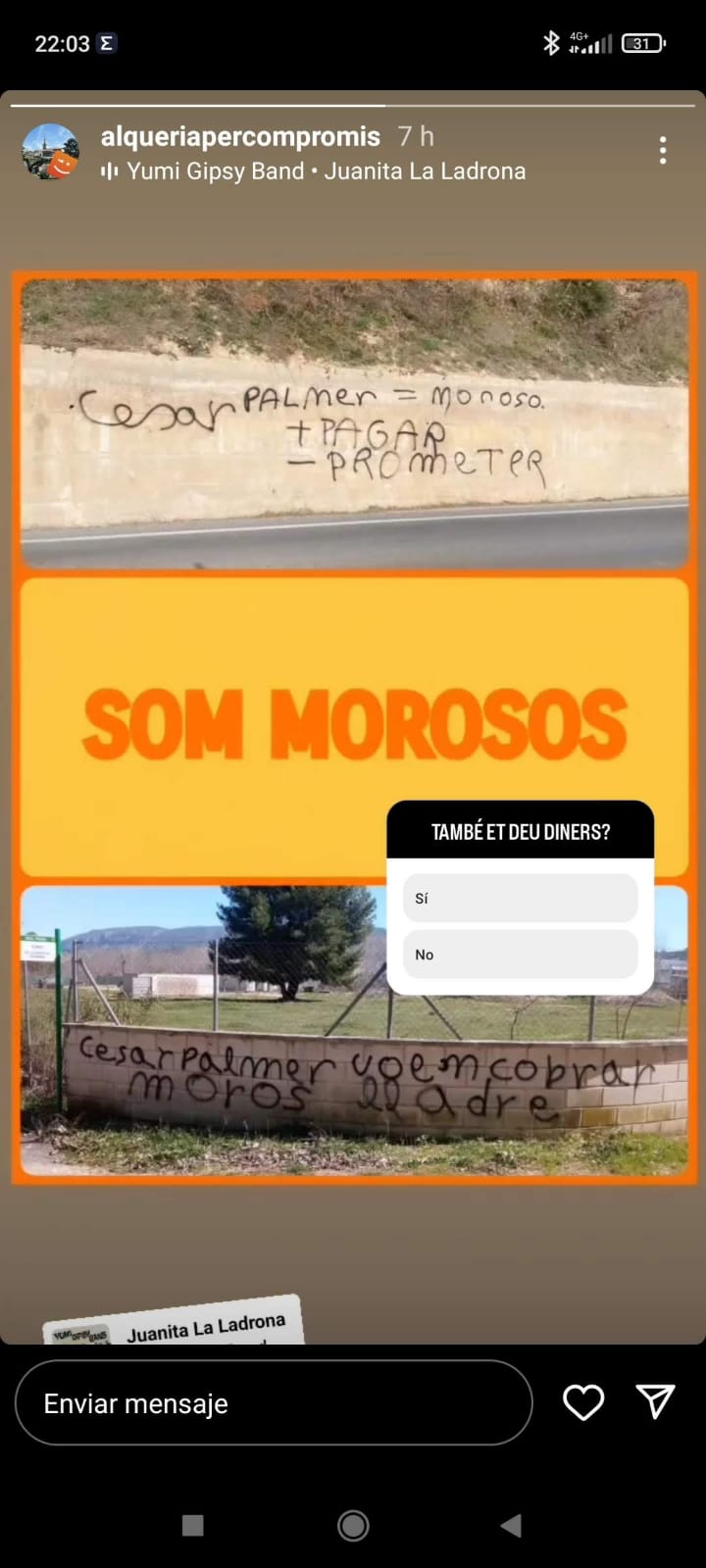 En paraules de César Palmer: “sabem que gent de la llista del PSOE està dient que som uns delinqüents i un partit de maricons” i “tot açò està fent que els pactes es ralentitzen”, tot i que no volen vincular-ho directament amb les pintades o el perfil fals. Per altre costat, tenen “una lleugera idea” de qui pot estar darrere d’aquesta campanya de desprestigi, però prefereixen ser prudents i no pronunciar-se “fins que no arribe una resolució judicial” arran la denúncia presentada davant la guàrdia civil.