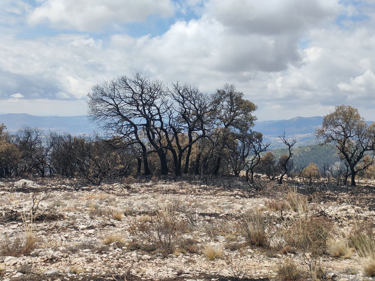 Segons explica el conseller, el foc va ser ràpid i va pujar en una llengua estreta fins al cim del Menejador. Això ha fet que alguns arbres encara estiguen vius. I a més, no ha arribat al Carrascar i la zona afectada era, en gran part, d'herba baixa. "Podem esperar que la mateixa vegetació es vaja regenerant". Així que de moment es faran tasques de control i seguiment per assegurar-se que la natura fa el seu treball. Es recomana ara no anar a eixa zona de la serra per no afectar la regeneració. I, si aneu, no abandoneu els camins.