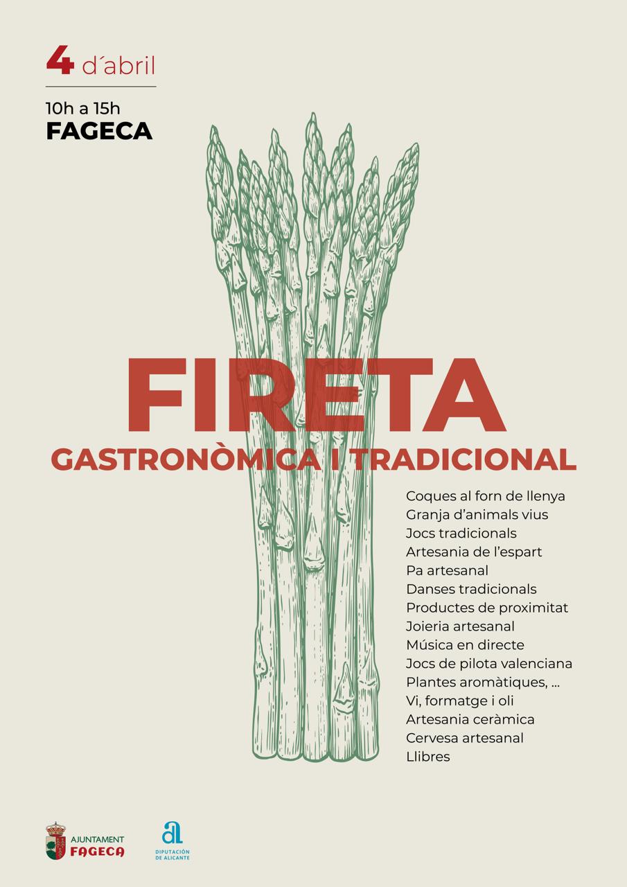 Dissabte 4 d'abril és el plat fort amb la Fireta Gastronòmica i Tradicional, que tindrà lloc en la plaça de 10 a 15 hores. Hi haurà coquetes fetes al forn de llenya, una granja amb animals, i diferents parades d'artesania i productes locals com plantes, joies, ceràmica i tèxtil. També una variada mostra de productes gastronòmics de proximitat com oli, melmelades, saladures, vi, cervesa o café. Tot arredonit amb música en directe, danses tradicionals i un taller d'espart.