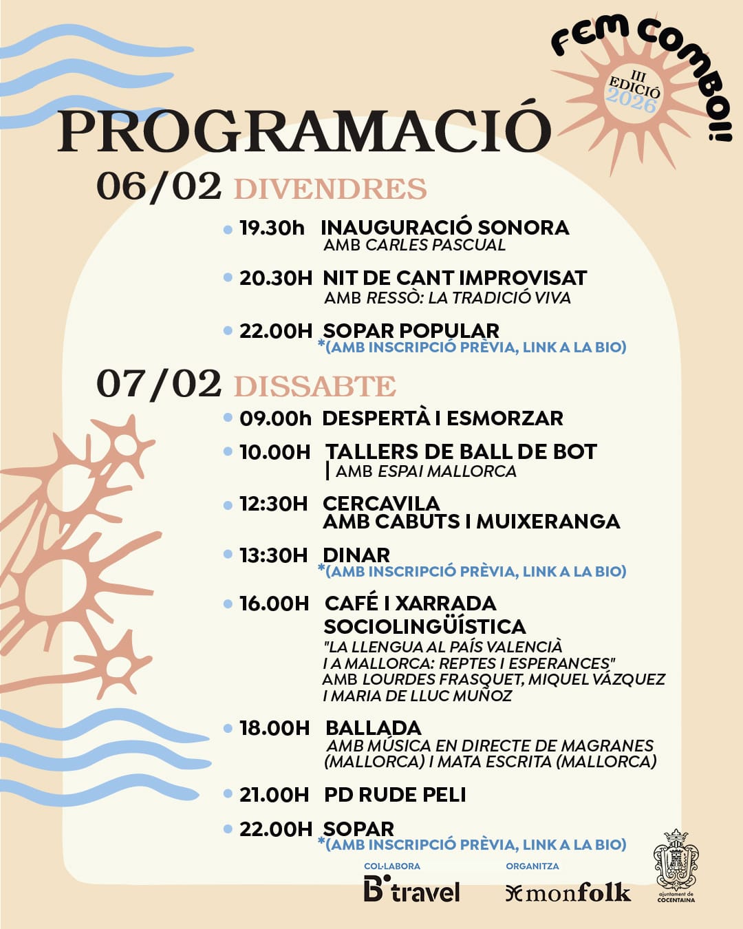 Al final de la notícia pots consultar el cartell amb horaris i activitats, però t'avancem que tot comença divendres 6 de febrer de vesprada amb una inauguració sonora a càrrec de Carles Pascual, una nit de cant improvisat i un sopar popular. Dissabte de matí hi haurà un taller del Ball de Bot i cercavila amb cabuts i muixeranga. I de vesprada una taula redona sobre la llengua, i un ball popular amb dos grups mallorquins: Magranes i Mata Escrita. "Mata Escrita, grup de música d’arrel popular pensada per ballar i fer plaça, i Magranes, un projecte que reivindica la presència femenina als escenaris del ball de bot. Dos propostes diferents, però complementàries que portaran a Cocentaina els sons i ritmes de l’illa amb una mirada viva i actual", expliquen des de l'organització. I tot conclourà amb un sopar. Atenció perquè per a les cites gastronòmiques cal inscripció prèvia.