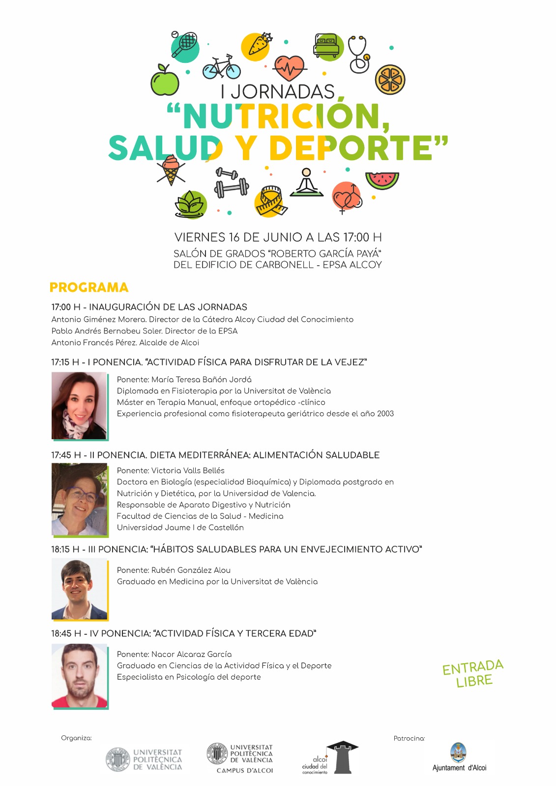 La Primera edició de les Jornades de “Nutrició, Salut i Esport” tindrà lloc el divendres 16 de juny a les 17 hores al Saló de Graus de l’Edifici Carbonell del Campus d’Alcoi de la Universitat Politècnica de València (UPV) amb entrada completament gratuïta.