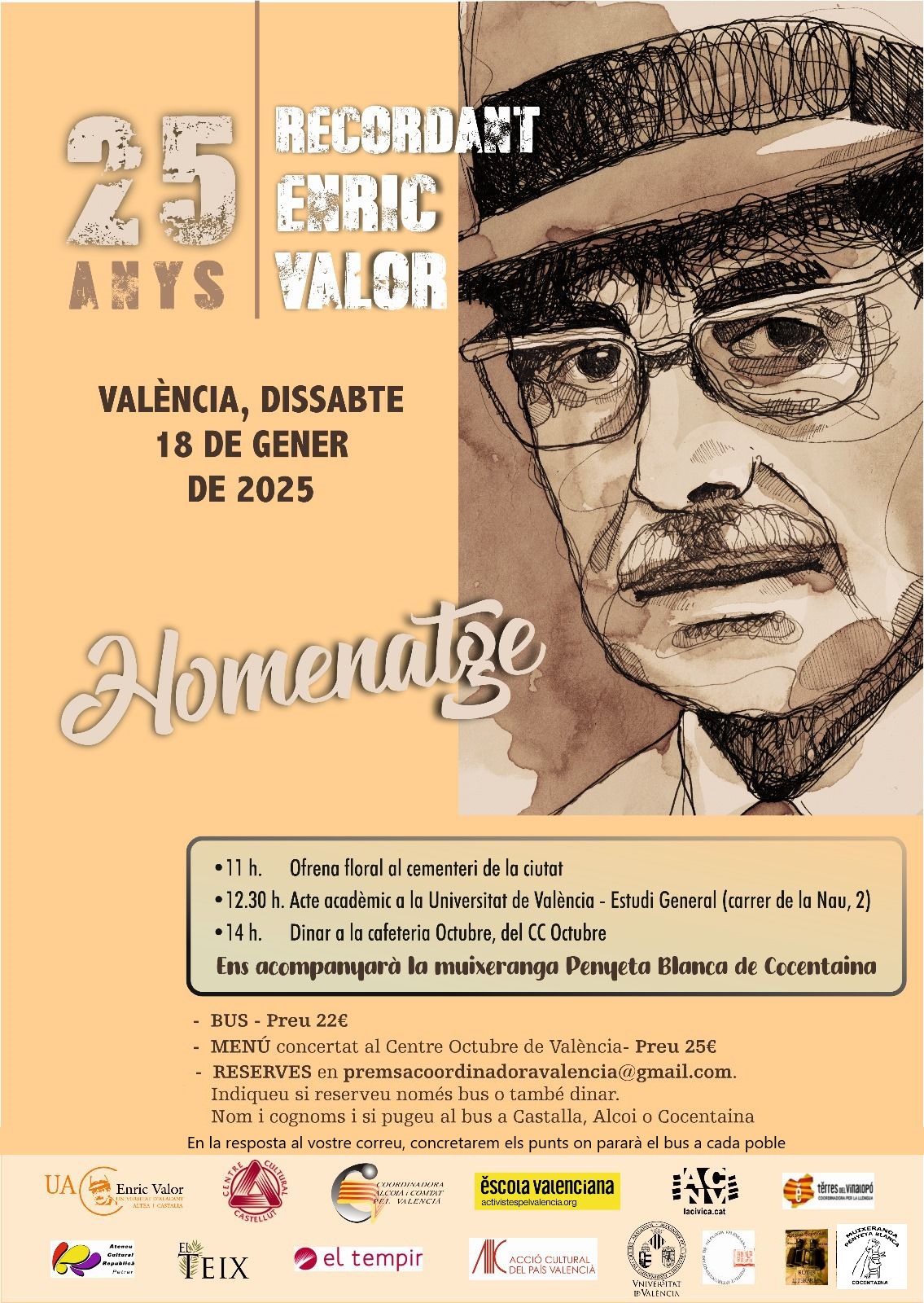 La Càtedra Enric Valor de la Universitat d'Alacant, del Centre Cultural Castellut, de la Coordinadora pel valencià de l'Alcoià i el Comtat (Escola Valenciana), l'Institut Interuniversitari de Filologia Valenciana, Acció Cultural del País Valencià i l'Ateneu Republicà de Petrer, entre altres entitats, han organitzat un acte homenatge pels 25 anys d’Enric Valor, que serà aquest 18 de gener.