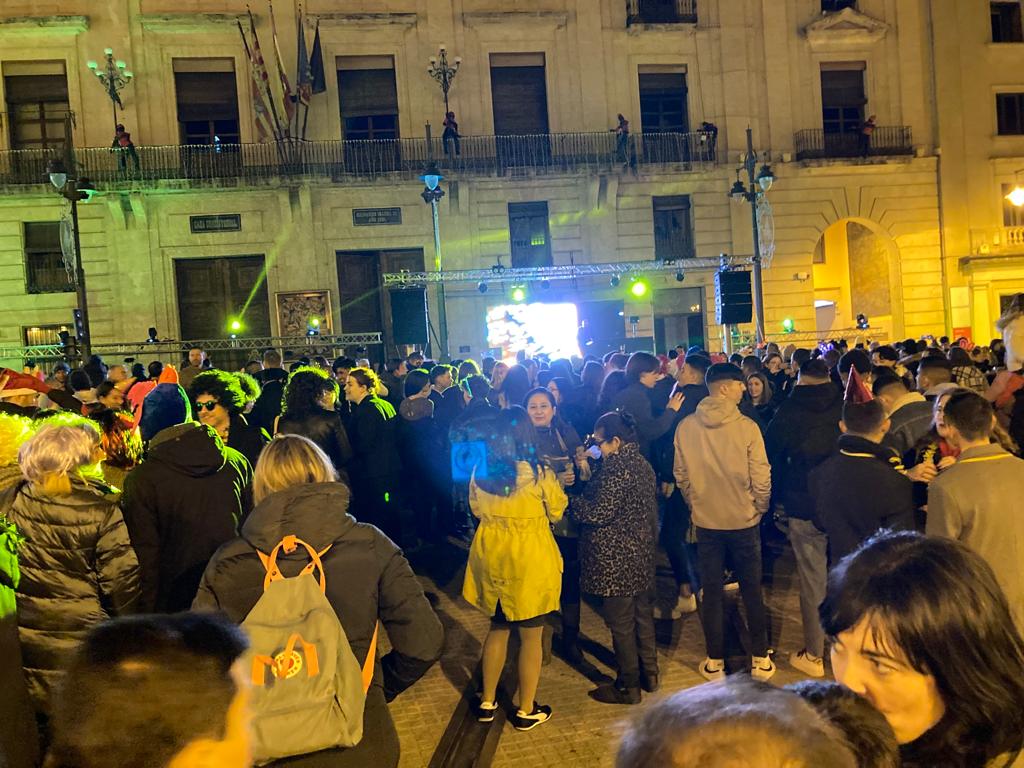 Amb molta alegria i originals disfresses (hi havia fins i tot dinosaures), unes 2000 persones han complit amb la tradició de les campanades, el raïm, el cava i la sidra. El DJ i la música eixia des de la façana de l'Ajuntament per a deixar lliure el betlem que serà adorat pels Reis el dia 5 de gener.