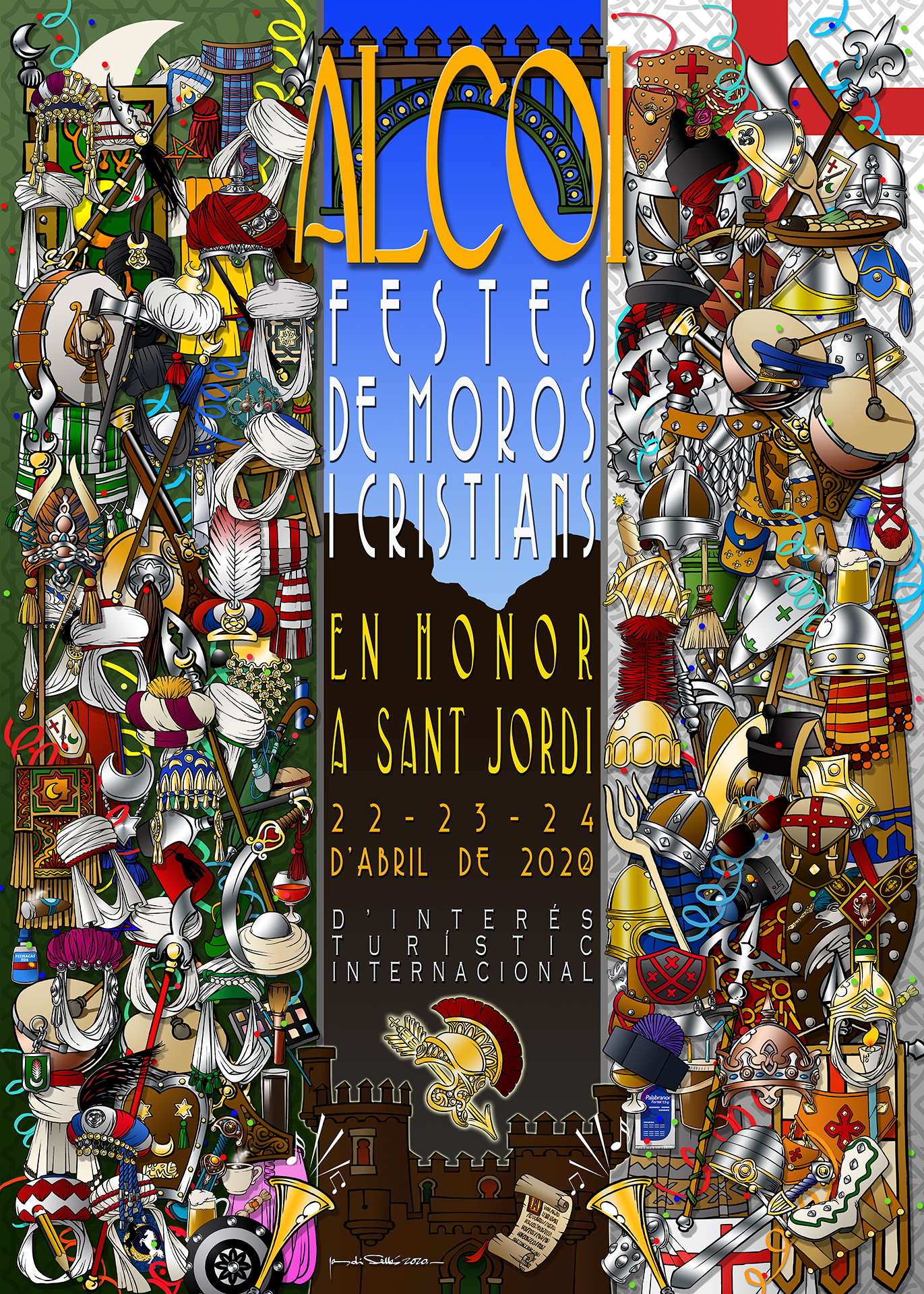 Ja s'ha descobert el cartell de festes, obra de Jordi Sellés, i que amb uns pocs metres de llenç ha aconseguit omplir la Bandeja de color i il·lusió. Ací el podeu vore, amb tots els turbants i armes que porten els festers, a més d'instruments i altres detalls que heu de buscar. Una mena de buscant a Wally que vol dir-nos: lleveu-vos els maldecaps i poseu-vos el casc de festes.