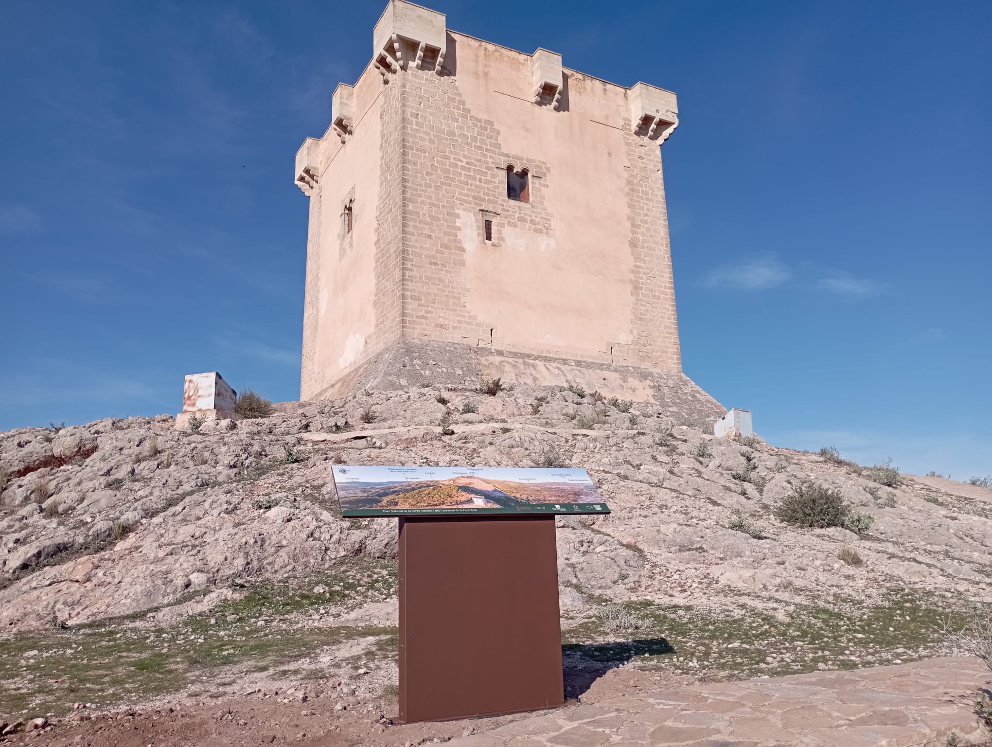 "Durant l’època ibèrica, segles IV-III aC, un immens poblat se situava al cim i als vessants i, en el segle X, ja en època islàmica, es va erigir la primera construcció arquitectònica, un possible castell o hisn, per al control i la gestió de la primera medina i de les diverses alqueries dels voltants, construcció que sols ha quedat com a testimoni d'una part del recinte emmurallat que servia per a acollir a la població islàmica i el ramat". Ara pots comprovar què veien des d'allà dalt i perquè triaren este lloc per a controlar tota la comarca.