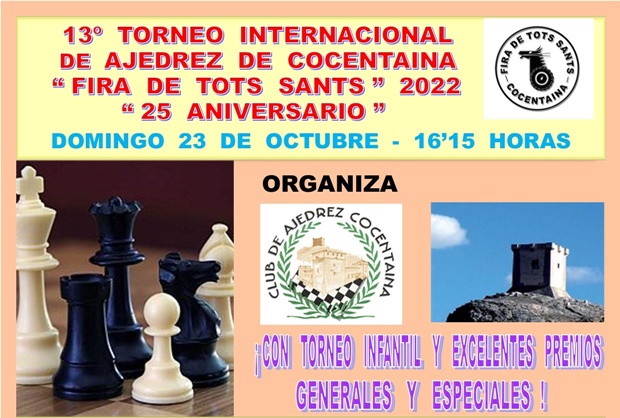 El proper diumenge 23 d’octubre tindrà lloc la nova edició del Torneig Internacional d’Escacs “Fira tots Sants”. Aquest esdeveniment té la finalitatde donar-li a la localitat de Cocentaina el seu prestigi en el panorama d'escacs nacional i internacional. A més, l’edició d’enguany és especial per al Club d’Escacs de Cocentaina, que celebra el seu 25 aniversari.